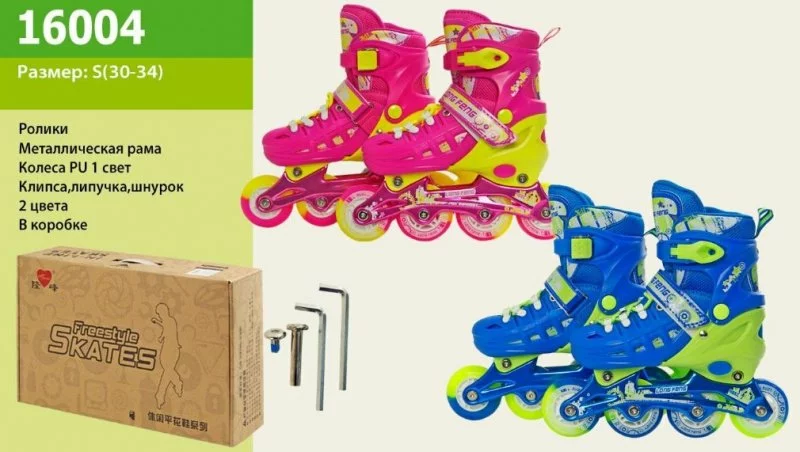 Фотография 1 товарной позиции интернет-магазина детских игрушек www.smarttoys.com.ua Ролики 16004 (6шт) S(30-34) метал.рама,кліпса,шнурок,2 кольори,в сумці
