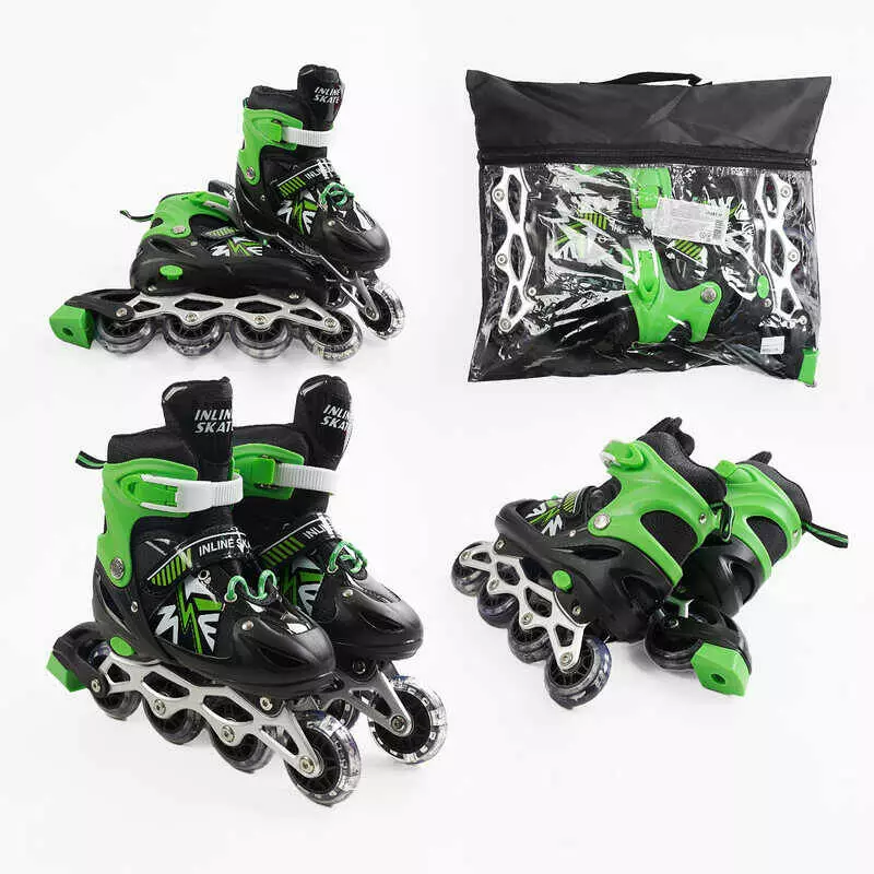 Ролики 39452-М /розмір 34-38/ колір – ЗЕЛЕНИЙ (6) колеса PVC, устілка 21-24 см, ПЕРЕДНЄ КОЛЕСО СВІТЛО, d – 6.5 см, в сумці
