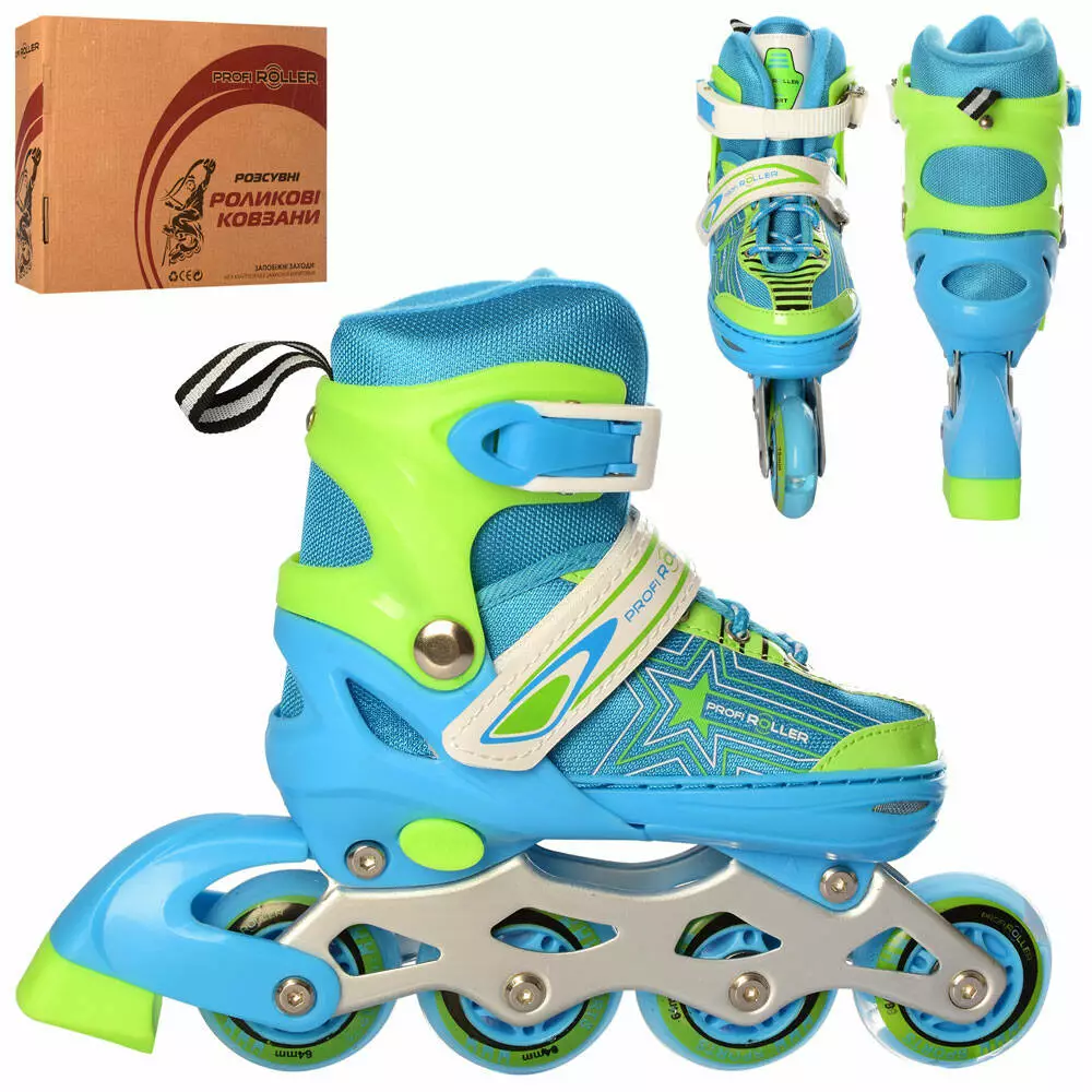 Фотография 1 товарной позиции интернет-магазина детских игрушек www.smarttoys.com.ua Ролики A 4138-S-BL(31-34) розсув., шнур.+бакля, ал.рама, кол.ПУ64мм-1світ., синій, кор., 35-27-10 см