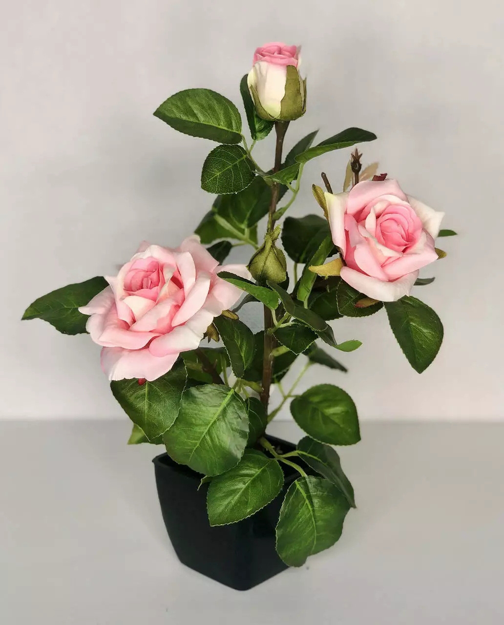Милый кустик розовой розы добавит вашему пространству эстетики и уюта. Благодаря компактным размерам, этот вазон можно разместить где угодно. Высота вместе с горшком составляет 29 см. Роза имеет три цветка и бутон, которые выглядят как живые.