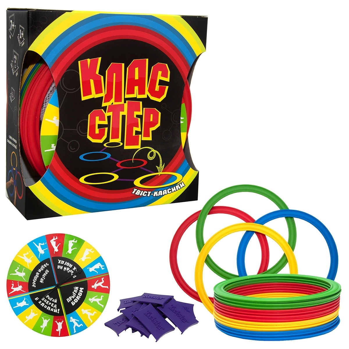 Стрибай вліво, стрибай прямо, стрибай ляскаючи в долоні! Весела гра «Клас Стер» нагадує знамениті "скакалки-класики", але відрізняється тим, що з яскравих кілець можна викласти на підлозі будь-які фігури. А обертаючи рулетку необхідно вибрати, яким чином подолати трасу - стрибати боком, плескати в стрибку або стрибати по кільцях одного кольору. І вперед! Переможе найуміліший і спритний. Крім розваги допоможе розвинутися фізично і поліпшити координацію. Кільця з'єднуються між собою за допомогою спеціальних затискачів. Всього в наборі 13 кілець різного кольору, 16 з'єднувачів-засувок і спеціальний мішечок для зберігання. Кільця виконані з пластика. Вік: 6 + Кількість учасників: від 2 до 4; Матеріал: пластик; Комплект: 13 кілець, 16 засувок, мішечок, рулетка, інструкція. Розмір упаковки: 27.5 х 26 х 11 см.