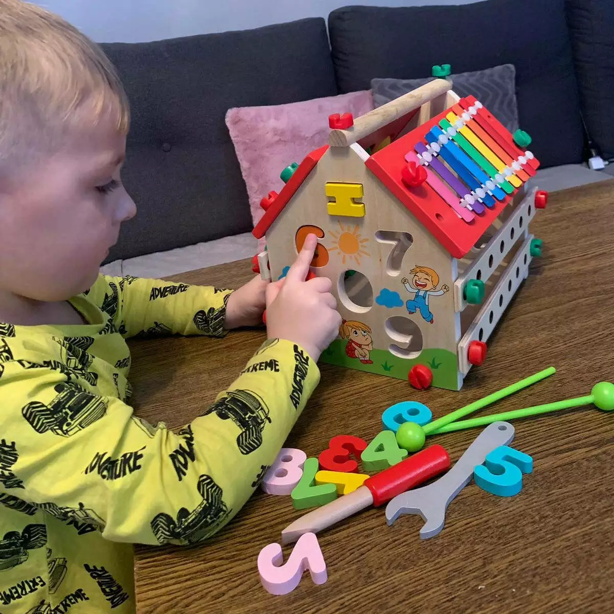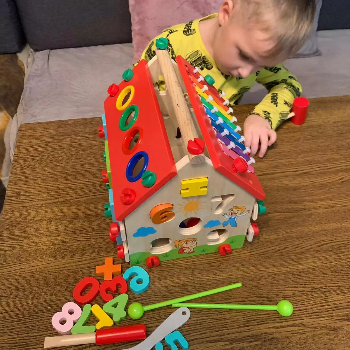 Багатофункціональність: Кожна сторона будиночка має унікальні ігрові елементи, включаючи сортери для форм, перфоратор і цифри, що робить гру ще цікавішою та корисною для розвитку.