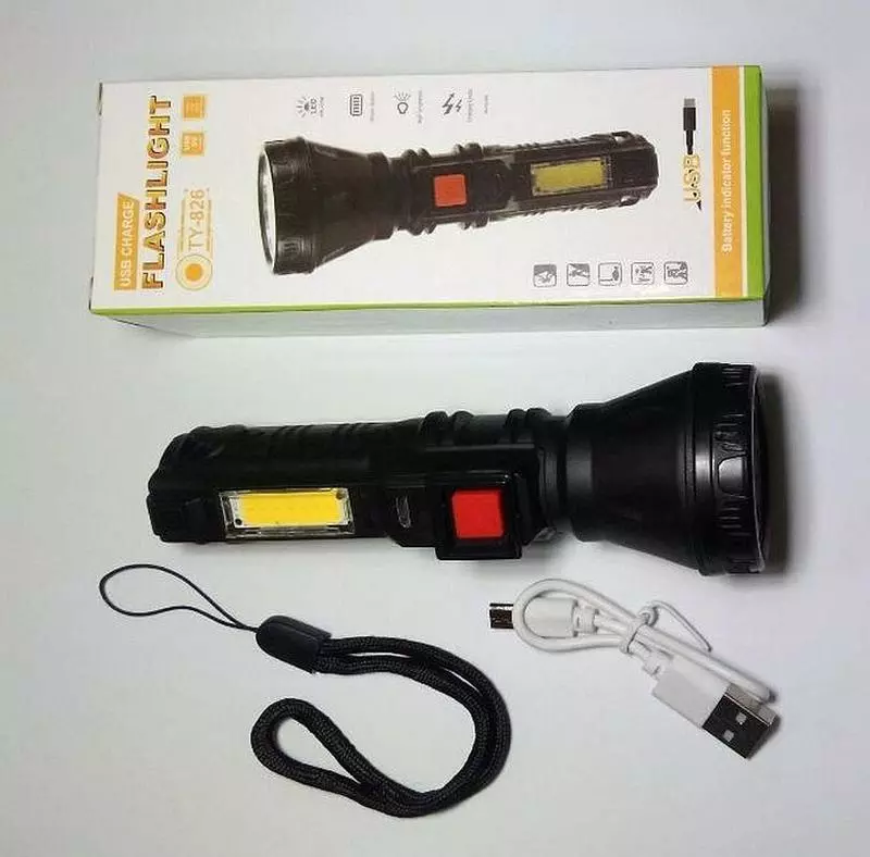 Фонарь, упаковка, кабель usb, шнурок