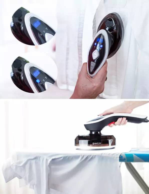 • Утюг - горизонтальная глажка. Благодаря большой керамической подошве, утюг также может использоваться как традиционный утюг – классически расположить выглаженную одежду на доске и использовать устройство горизонтально.