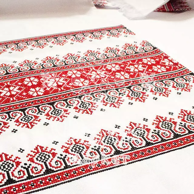 Традиційний червоний рушник широко використовується в українських обрядах. Використана машинна вишивка "рахунковим хрестом".