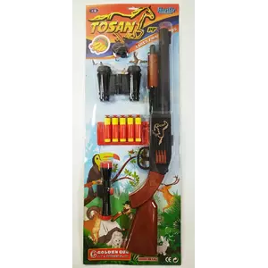 "Тосан ПФ" рушниця стріляє м'якими поролоновими кулями на присосках Довжина - 50 см Висота - 10 см. Комплект: рушниця, чотири м'які поролонові кулі на присосках, оптичний приціл, бінокль чорного кольру, ремінь поліпропіленовий. Упаковка: поліпропіленова на картонній основі. Вага: 310 грам. Артикул: 925 В ящику: 24шт.
