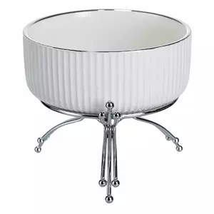 Порцелянова салатниця на металевій підставці призначена для подачі салатів, закусок або фруктів, забезпечуючи акуратний і впорядкований вигляд столу. Поєднання гладкої порцеляни та металевої основи створює витончений контраст матеріалів, який гармонійно вписується у будь-який стиль сервірування. Завдяки компактним розмірам салатниця зручна для використання як на щоденних обідах, так і під час святкових подій.
