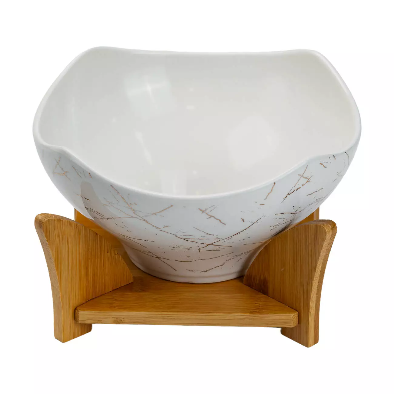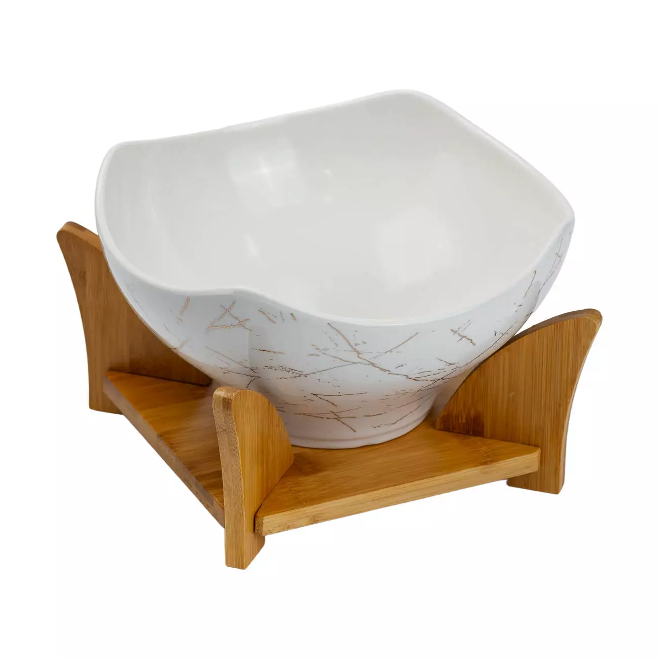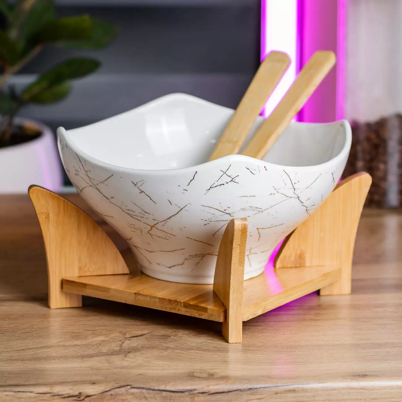 Салатниця встановлюється на стильну бамбукову підставку, яка забезпечує її стабільність та зручне розташування на столі. Підставка не лише функціональна, але й естетично приваблива. Цей набір стане чудовим подарунком для любителів вишуканого посуду та створить атмосферу затишку та гармонії на вашій кухні.