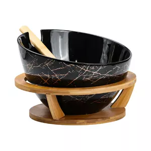 Вся конструкція розміщена на зручній бамбуковій підставці, яка не тільки підвищує естетичний вигляд, але й забезпечує стабільність і легкість використання. Ця салатниця стане чудовим доповненням до будь-якого обіднього сервізу, поєднуючи в собі функціональність і витонченість.