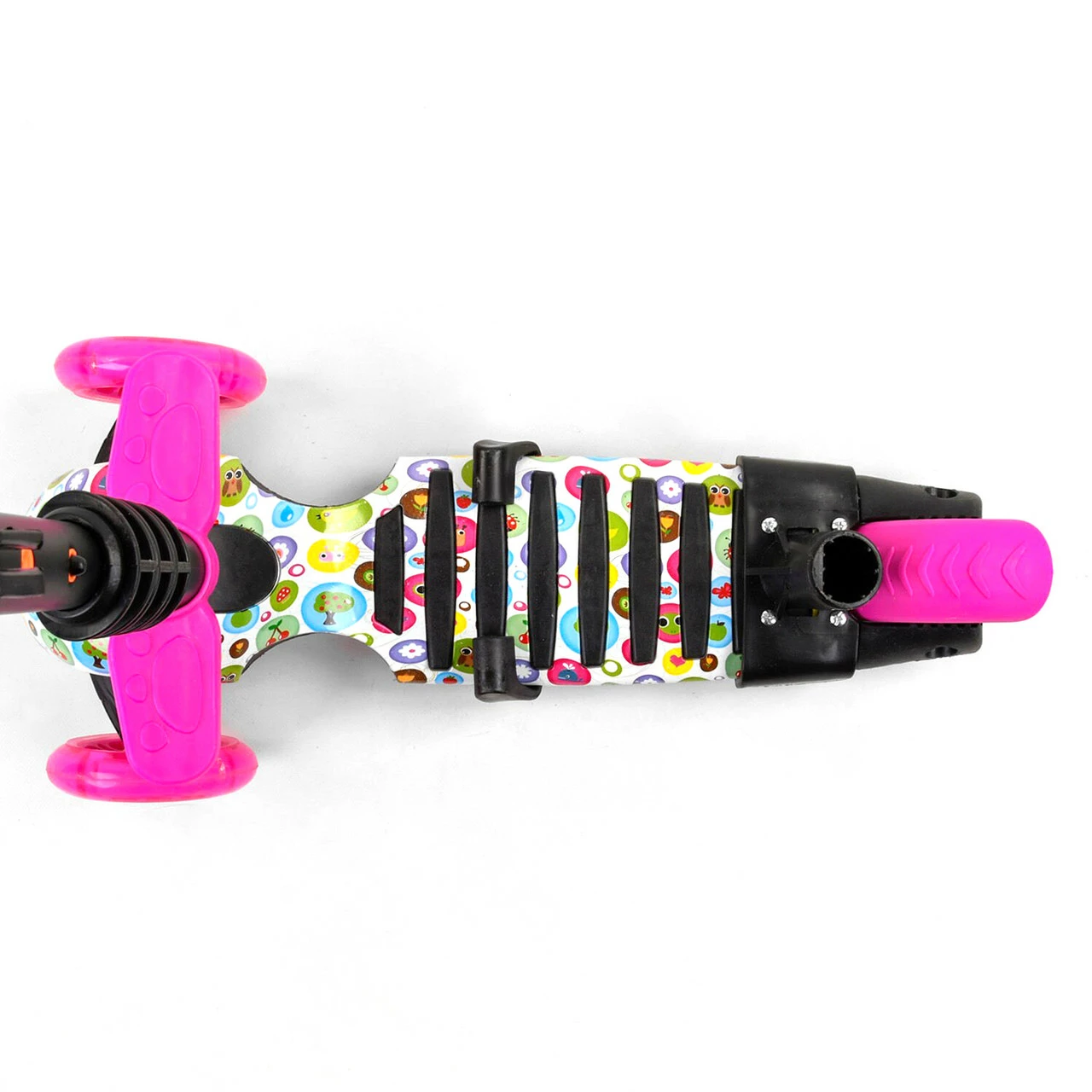 2 вида колес. Два передних светятся и изготовлены из полиуретана (PU), а заднее - из поливинилхлорида (пластика PVC); Размеры самоката: