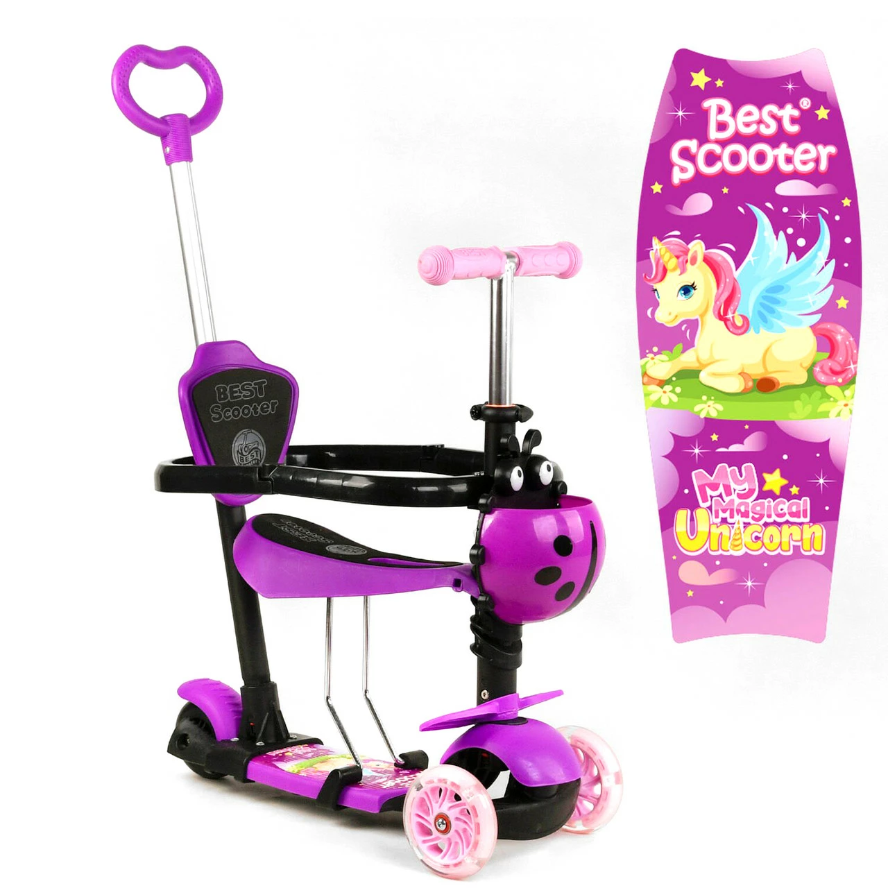 Детский самокат Scooter 5 в 1 предназначен специально для малышей! Благодаря наличию удобного сидения, подножек и ручки родительского контроля, даже самые маленькие детки будут чувствовать себя комфортно во время прогулки. Особенности: