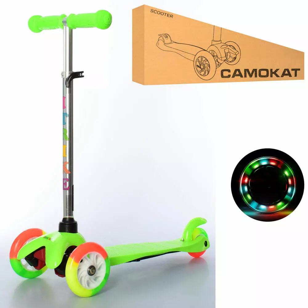 Фотография 1 товарной позиции интернет-магазина детских игрушек www.smarttoys.com.ua Самокат BB 3-013-4-A-GR MINI,алюм.+пласт.,3кол.ПУ-світ.,2пер.120мм,заднє 70мм,підніжка,кермо 60/69см