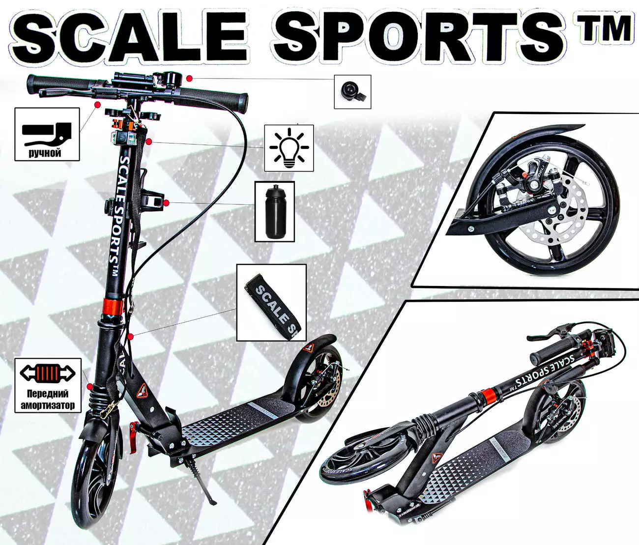 <p>Стильный самокат<strong> Scooter Scale Sports SS-12 с дисковым тормозом</strong> разработан для подростков и взрослых американской компанией <strong>Scale Sports.</strong></p><br /> <p><strong>Особенности самоката Scale Sports SS-12</strong><strong>:</strong></p><br /> <ul><br /> <li>Складная конструкция;</li><br /> <li>Дзвонок на руле.</li><br /> <li>LED-фонарик (три режима подсветки)</li><br /> <li>Держатель для бутылки</li><br /> <li>Ручной дисковый тормоз выведен на заднее колесо;</li><br /> <li>Ножной металлический тормоз;</li><br /> <li>Регулируемый руль на три положения;</li><br /> <li>Резиновые ручки;</li><br /> <li>Амортизатор -1 (передний);</li><br /> <li>Ножка для парковки (подножка)<strong>;</strong></li><br /> <li>Нескользящее покрытие платформы ;</li><br /> <li>Максимальная нагрузка: 100 кг;</li><br /> </ul><br /> <p><strong>Технические характеристики самоката Scale Sports SS-12 :</strong></p><br /> <ul><br /> <li>Тип самоката: городской;</li><br /> <li>Количество шт., тип колес: 2 литых;</li><br /> <li>Материал колес: полиуретан;</li><br /> <li>Размер переднего и заднего колеса – 200 мм;</li><br /> <li>Габаритный размер (ДхШ): 88х11</li><br /> <li>Высота регулируется в 3 положениях: <a href="tel:91/98/105">76/82/</a>88 см от платформы;</li><br /> <li>Платформа: 52х11 см;</li><br /> <li>Вес самоката: 4.5 кг;</li><br /> <li>Материал рамы: алюминий;</li><br /> <li>Цвет: черный;</li><br /> <li>Возрастная группа: для подростков и взрослых, <strong>7</strong>+;</li><br /> </ul><br />