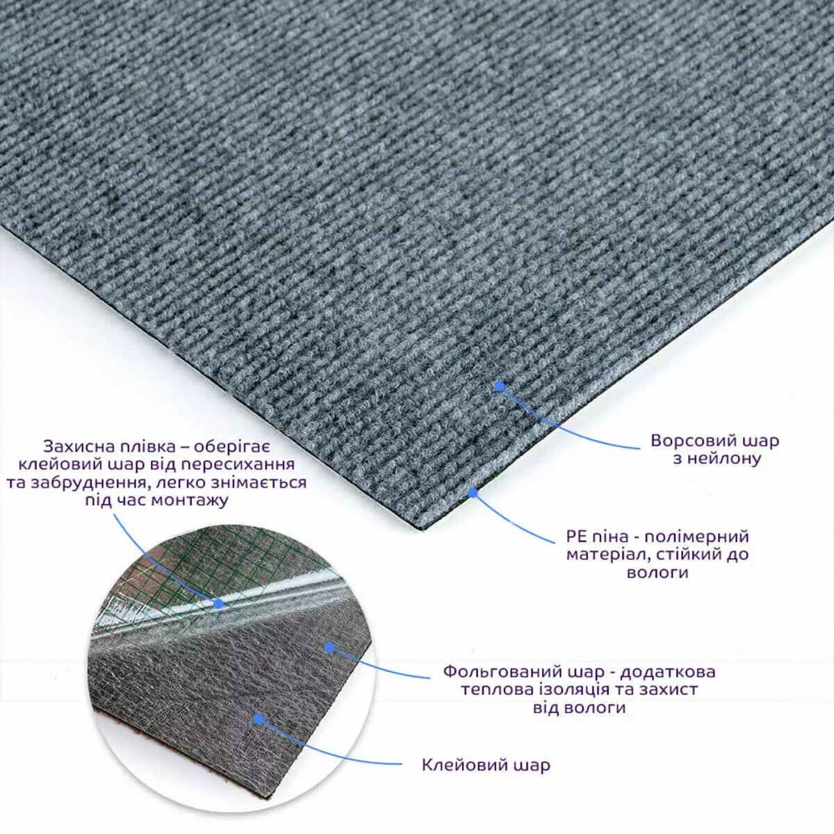 • Захисна плівка: зберігає клейовий шар від пересихання та забруднення, легко знімається під час монтажу.