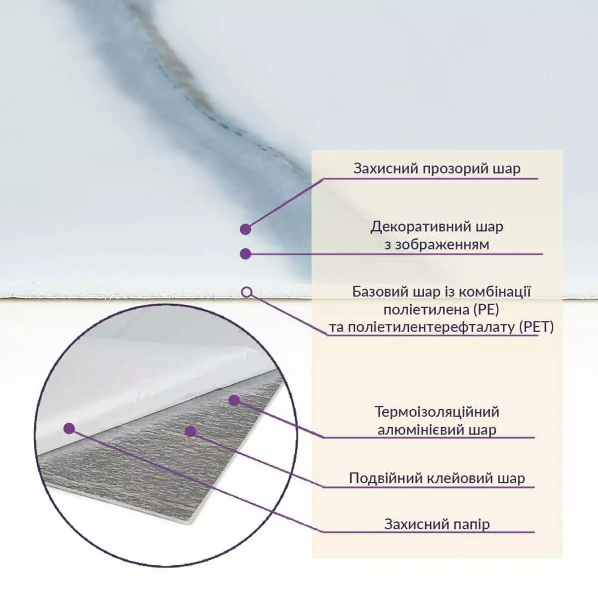 • Базовий шар з комбинації поліетилена (PE) і поліетилентерефталату (PET)