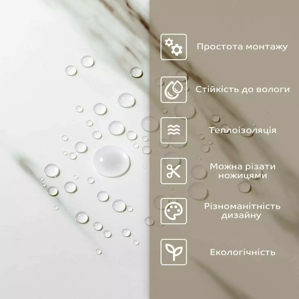 • 2. Стійкість до вологи: матеріал стійкий до впливу вологи та пари, а також до появи плісняви, що робить його придатним для використання у приміщеннях з високою вологістю, таких як ванни та кухні. Плитка підходить для створення фартуха кухні, можна клеїти біля плити на відстані не менше ніж 20-25 см;