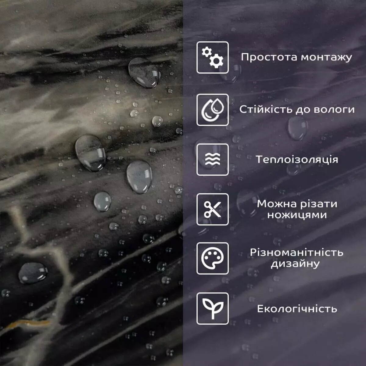 • 2. Стійкість до вологи: матеріал стійкий до впливу вологи та пари, а також до появи плісняви, що робить його придатним для використання у приміщеннях з високою вологістю, таких як ванни та кухні. Плитка підходить для створення фартуха кухні, можна клеїти біля плити на відстані не менше ніж 20-25 см;