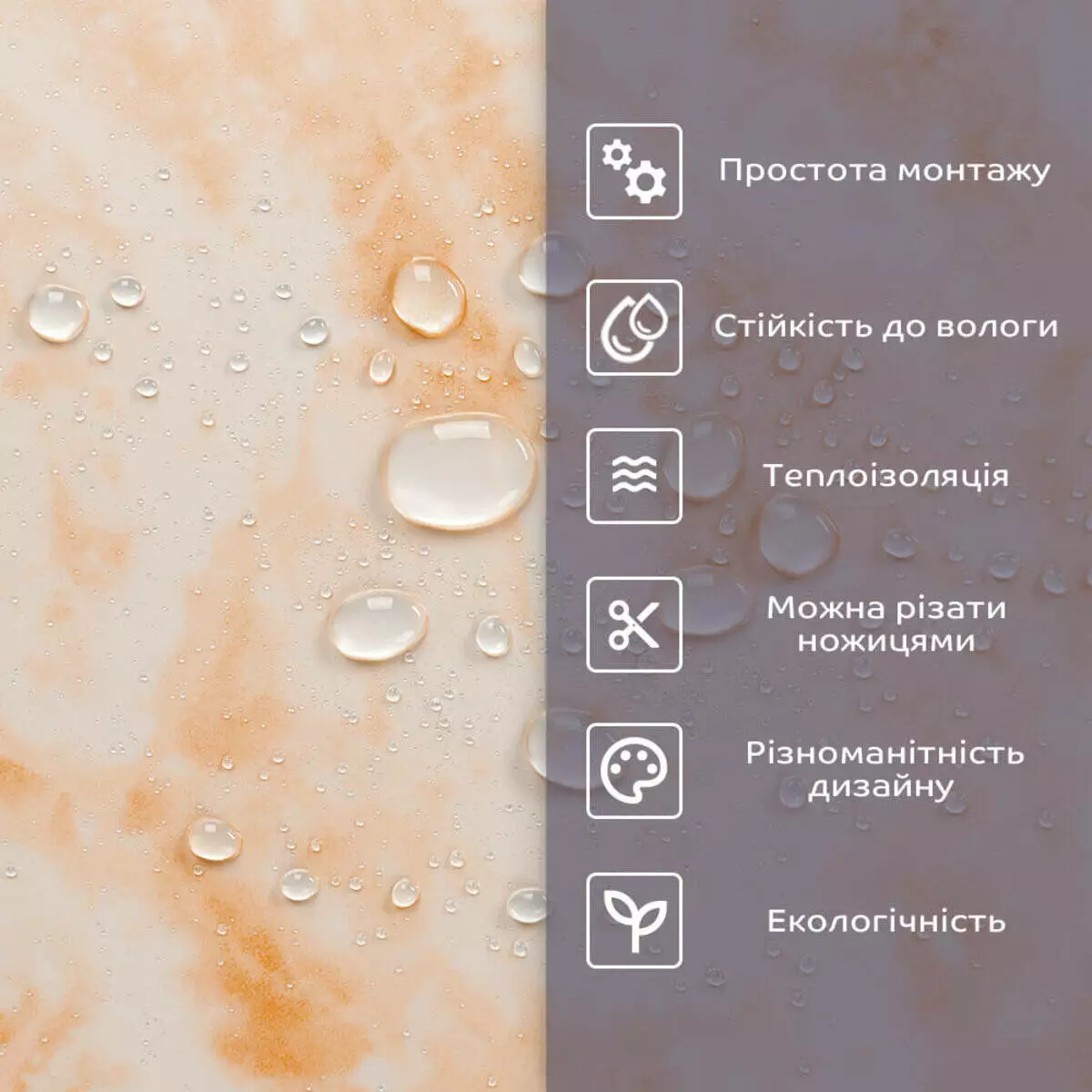 • 2. Стійкість до вологи: матеріал стійкий до впливу вологи та пари, а також до появи плісняви, що робить його придатним для використання у приміщеннях з високою вологістю, таких як ванни та кухні. Плитка підходить для створення фартуха кухні, можна клеїти біля плити на відстані не менше ніж 20-25 см;
