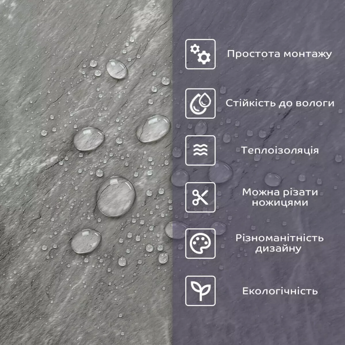 • 2. Стійкість до вологи: матеріал стійкий до впливу вологи та пари, а також до появи плісняви, що робить його придатним для використання у приміщеннях з високою вологістю, таких як ванни та кухні. Плитка підходить для створення фартуха кухні, можна клеїти біля плити на відстані не менше ніж 20-25 см;