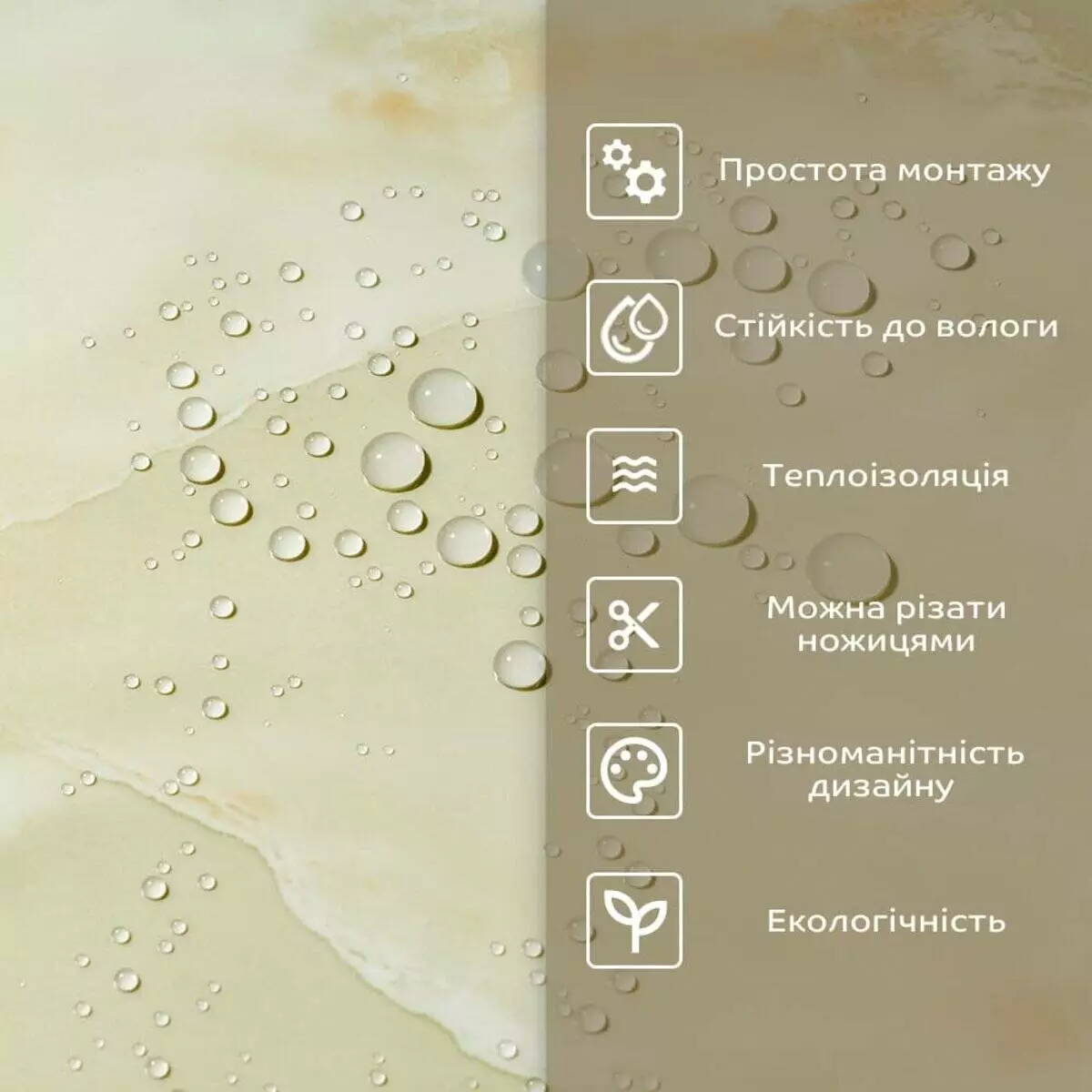 • 2. Стійкість до вологи: матеріал стійкий до впливу вологи та пари, а також до появи плісняви, що робить його придатним для використання у приміщеннях з високою вологістю, таких як ванни та кухні. Плитка підходить для створення фартуха кухні, можна клеїти біля плити на відстані не менше ніж 20-25 см;