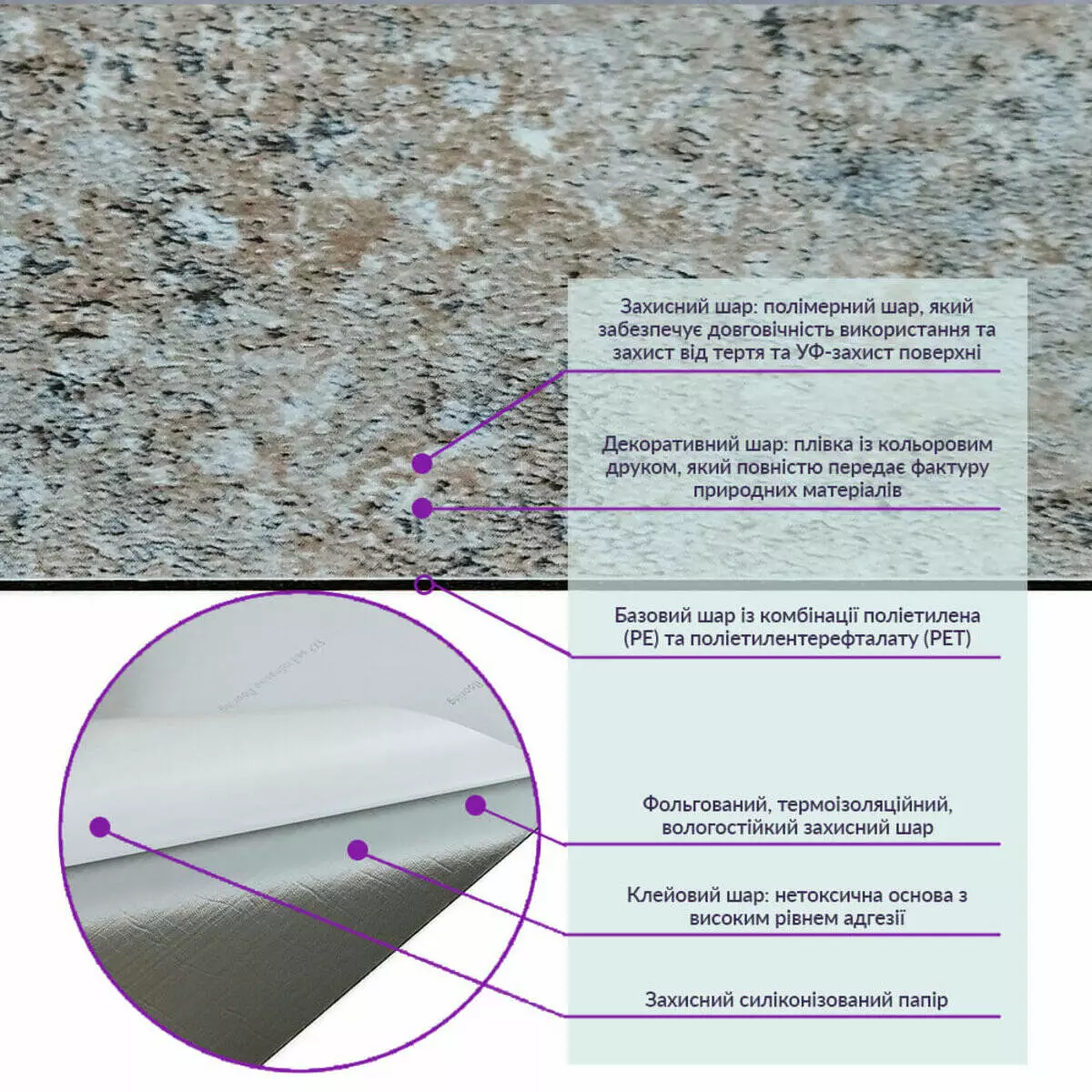 1. Полімерний шар: захищає від потертостей та дрібних механічних пошкоджень, забезпечує довговічність використання, а УФ захист допомагає запобігти вигоранню, зберігаючи колір насиченим.