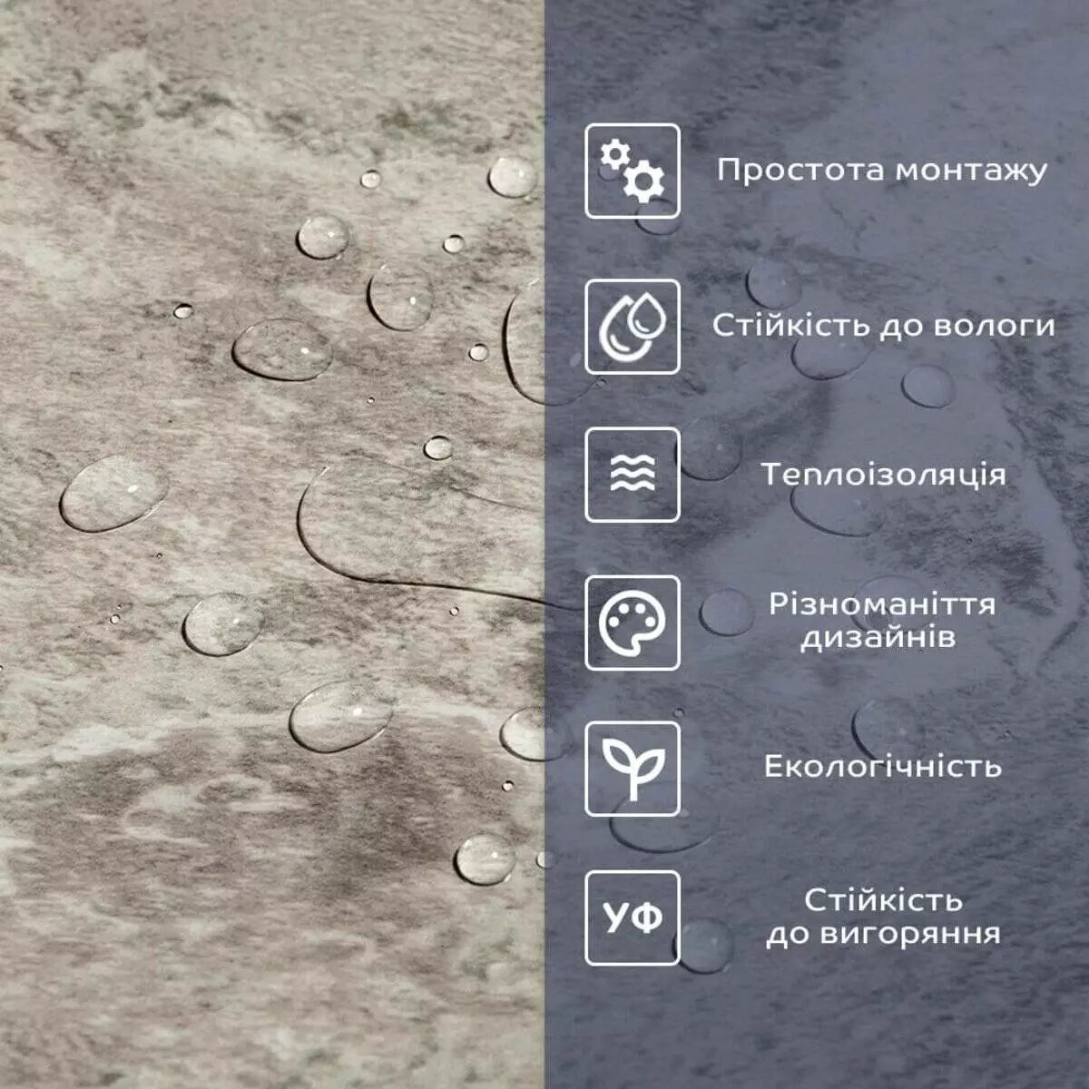 2. Стійкість до вологи: вінілова плитка стійка до вологи, що робить її відмінним вибором для ванних кімнат, кухонь та інших приміщень з підвищеною вологістю, матеріал стійкий також до впливу пари, а також до появи плісняви. Плитка підходить для створення фартуха кухні, можна клеїти біля плити на відстані не менше ніж 30-50 см;
