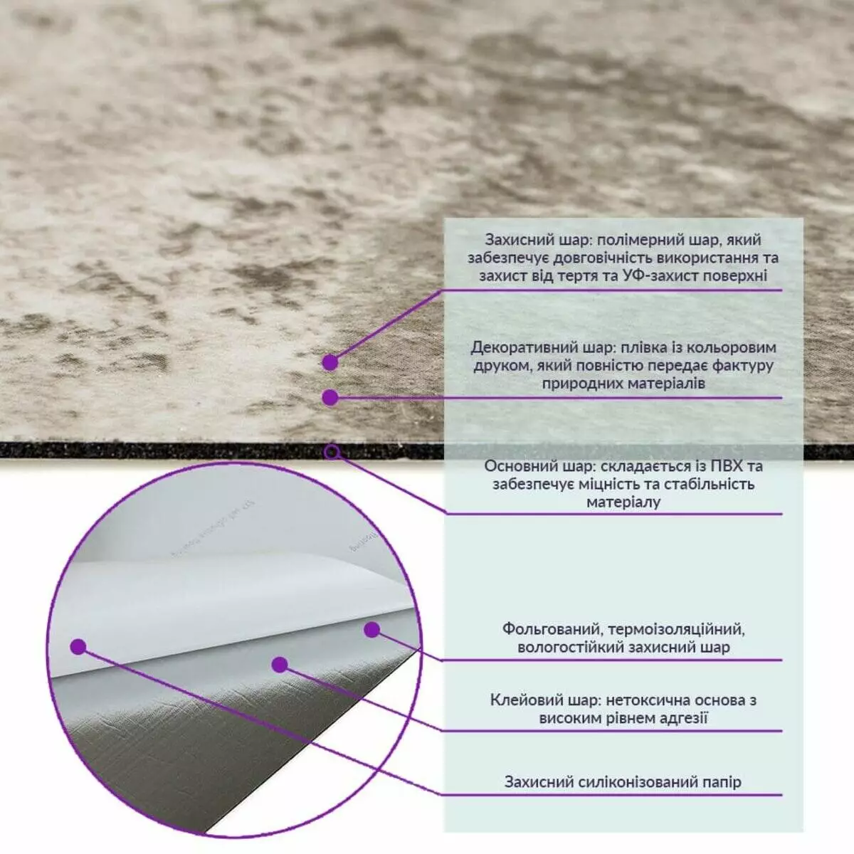 1. Полімерний шар: захищає від потертостей та дрібних механічних пошкоджень, забезпечує довговічність використання, а УФ захист допомагає запобігти вигоранню, зберігаючи колір насиченим.