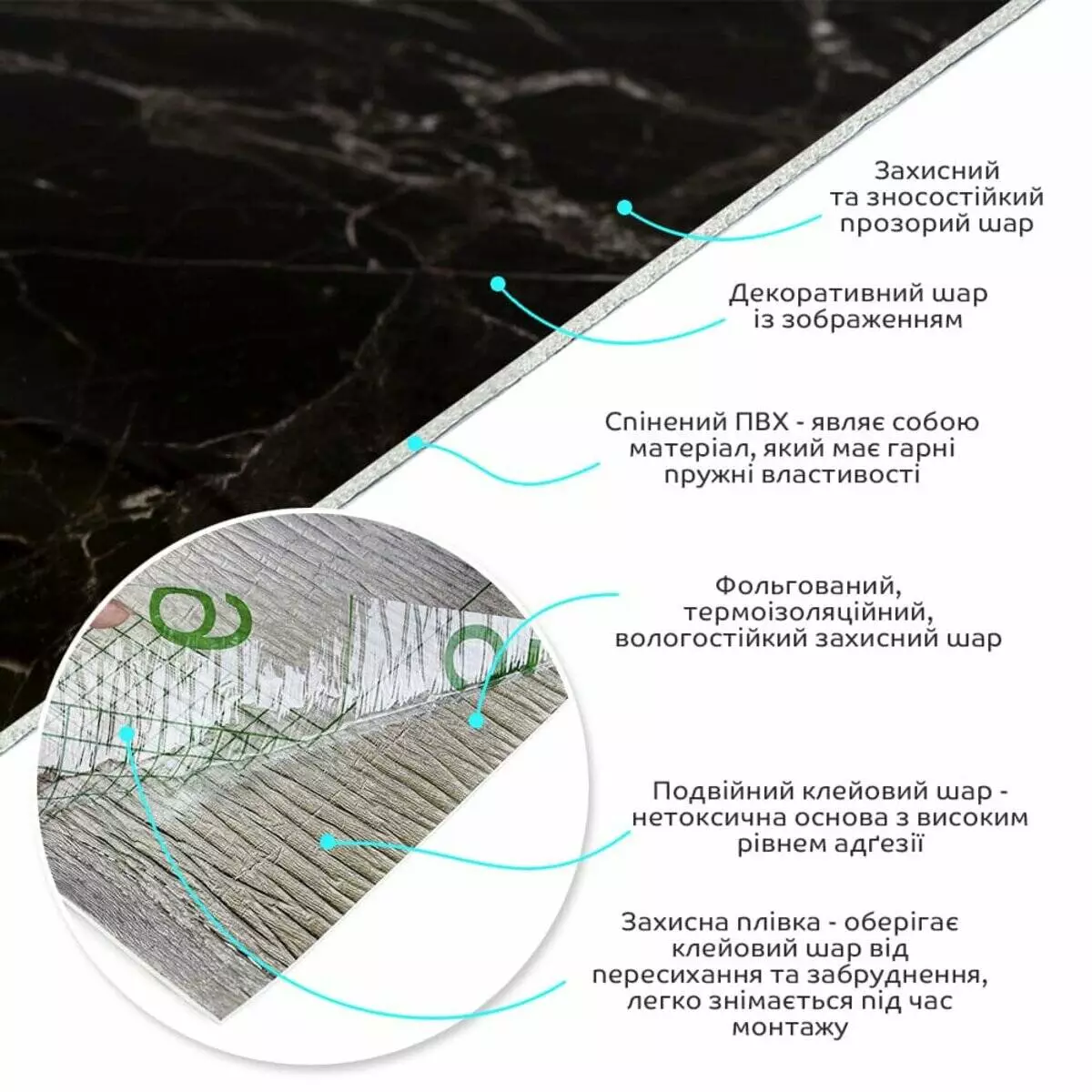 • Декоративний шар: плівка з кольоровим друком високої роздільної здатності, яка повністю імітує фактуру природних матеріалів завдяки чіткому та детальному зображенню.