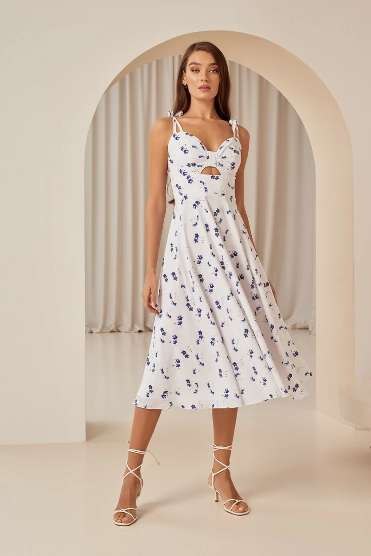 Цей прекрасний сарафан на зав'язках — втілення ніжності та романтики. Виготовлений із м'якого та приємного на дотик софту, оточить вас комфортом і легкістю. Оригінальний дизайн сарафана поєднує в собі красу синіх кольорів на ніжно-молочному тлі, створюючи прекрасний контраст і притягуючи погляди. Плавні лінії створюють витончений силует, підкреслюючи вашу жіночність і витонченість. Цей сарафан ідеально підходить для літніх прогулянок, побачень або відпочинку на пляжі. Ви будете відчувати свободу і легкість рухів, насолоджуючись зручністю і красою цього вбрання.