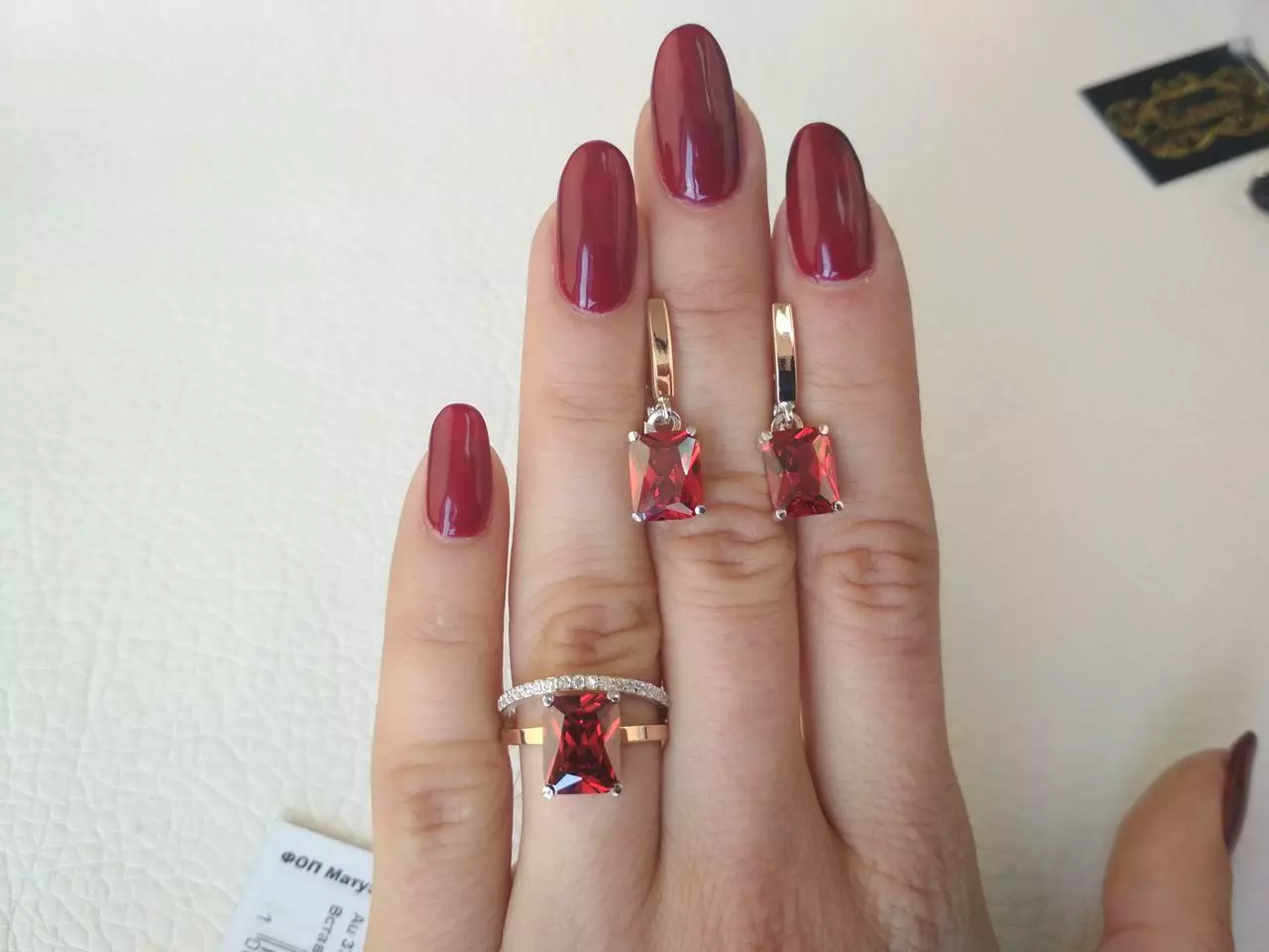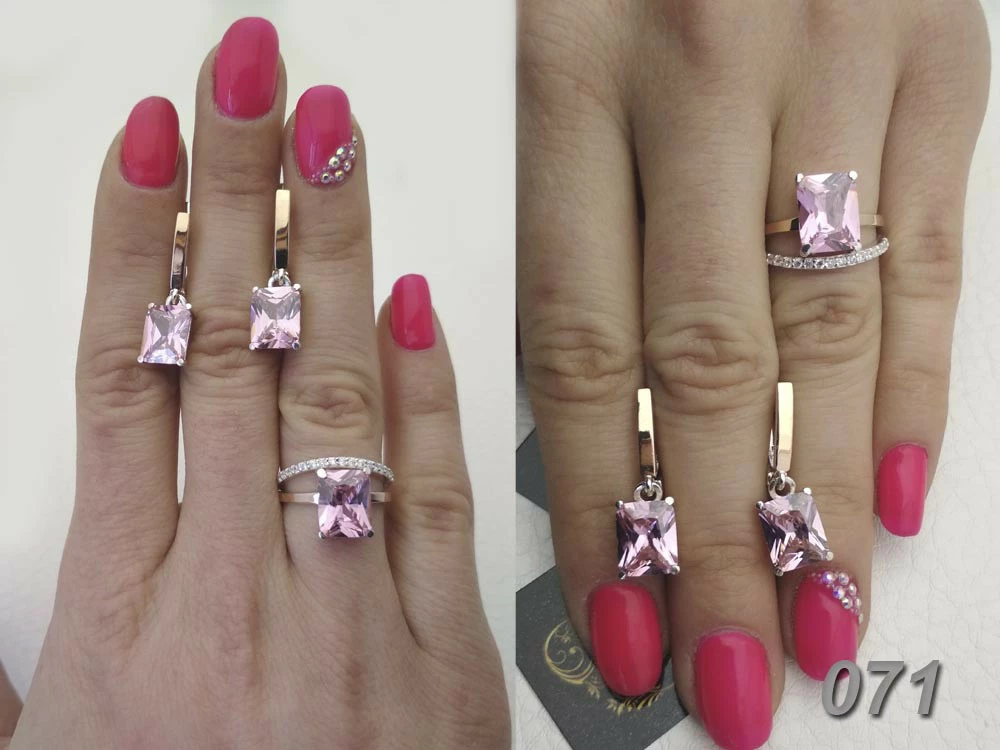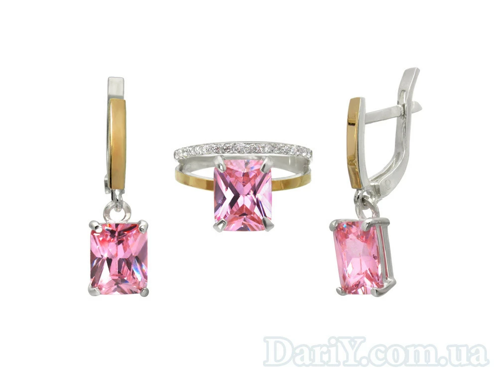 Кольцо и серьги с большим розовым прямоугольным камнем и золотыми