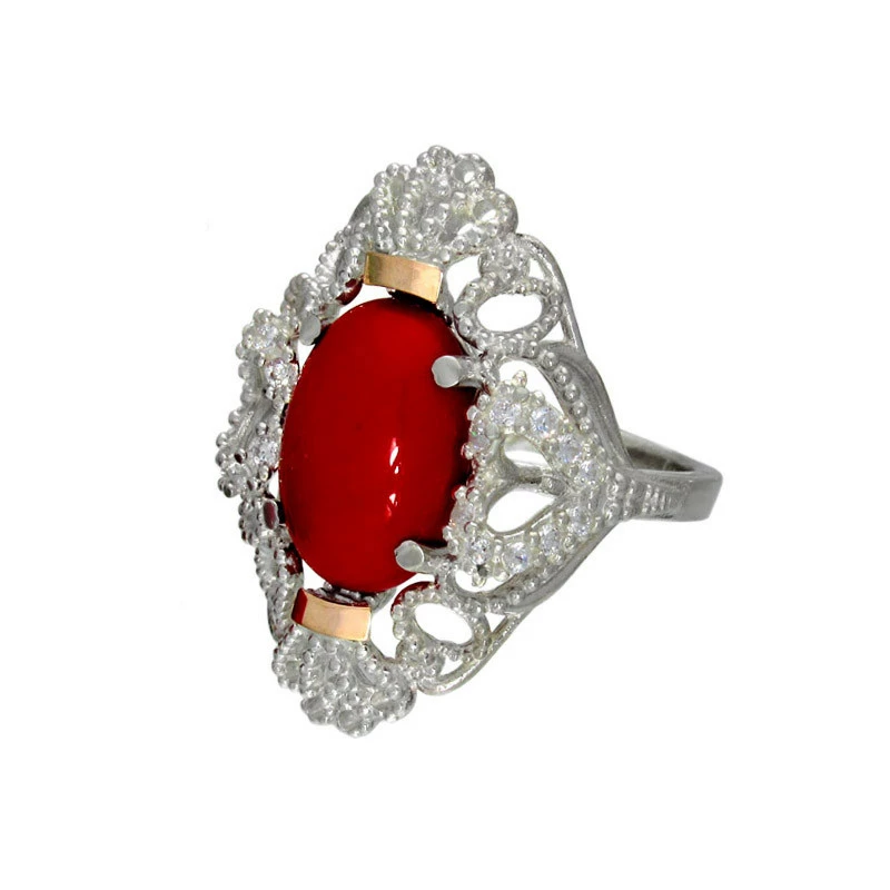 Серебряное кольцо с золотыми накладками и большим овальным камнем