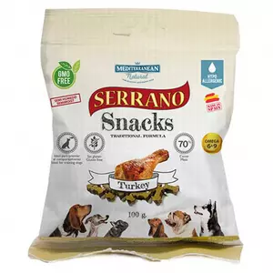 SERRANO снеки для собак 100g, индейка SERRANO от MEDITERRANEAN NATURAL - это 100% натуральные лакомства для собак, изготовленные из мяса и рыбы высокого качества. Содержат масло орегано и розмарин, природные антиоксиданты, которые улучшают пищеварение. Гипоаллергенны, не содержат глютена, искусственных красителей, ГМО, трансжирных кислот. Состав Мясо 70% (минимум 10% мяса индейки), рис, растительный глицерин, консерванты: пропионовая кислота, формут кальция, лимонная кислота. Пищевые добавки: масло орегано. Аналитические составляющие: Белок: 25,7%, жир 6,1%, сырая зола 10,2%, клитковина 0,9%, влага: 16,6%, 320 ккал / 100г. омега 6: 0,6 г / 100 г, омега 9: 1,5 г / 100 г.
