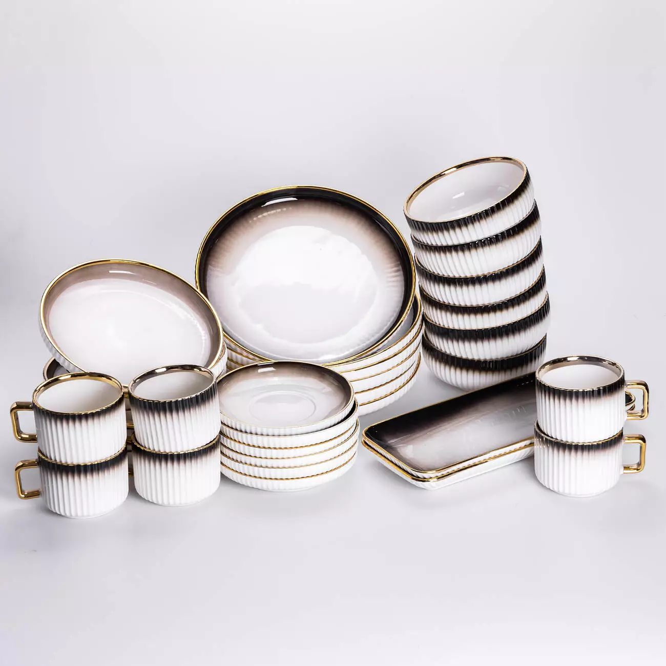 Кожна деталь продумана для зручності: супові тарілки об’ємом 500 мл підходять для перших страв, а чашки на 300 мл — для чаю чи кави. У наборі представлені тарілки різних розмірів (25 см, 20 см, 14,5 см, 9 см та прямокутна 30×13 см), що дозволяє сервірувати основні страви, закуски та десерти. Висота тарілок варіюється від 6 см до 2 см, завдяки чому зручно підібрати потрібний формат для кожної страви.