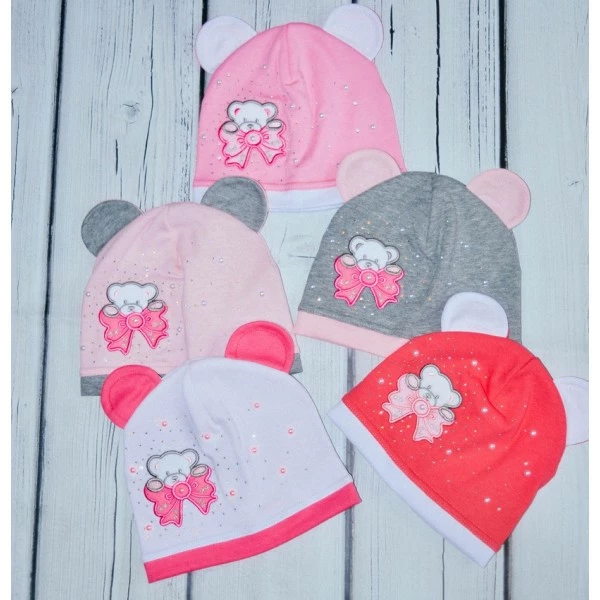 Красивая и стильная шапочка не только подчеркнет индивидуальность Вашей крохи, но также защитит голову в плохую погоду. Предлагаем вариант для вашей маленькой модницы – шапочка Мишутка. Этот невероятно милый аксессуар выполнен в нежном оттенке и украшен девчачьим модным принтом «мишка с бантом». Комфорт и удобство будут обеспечены Вашему ребенку в такой шапочке.