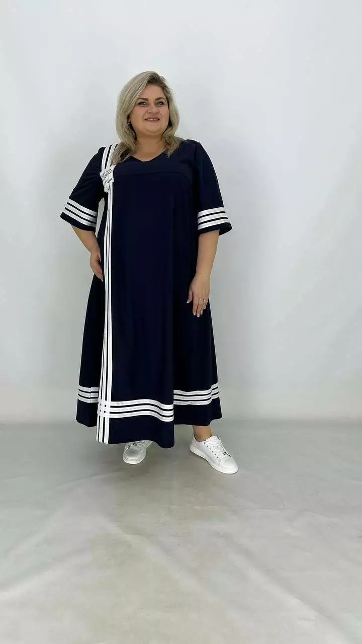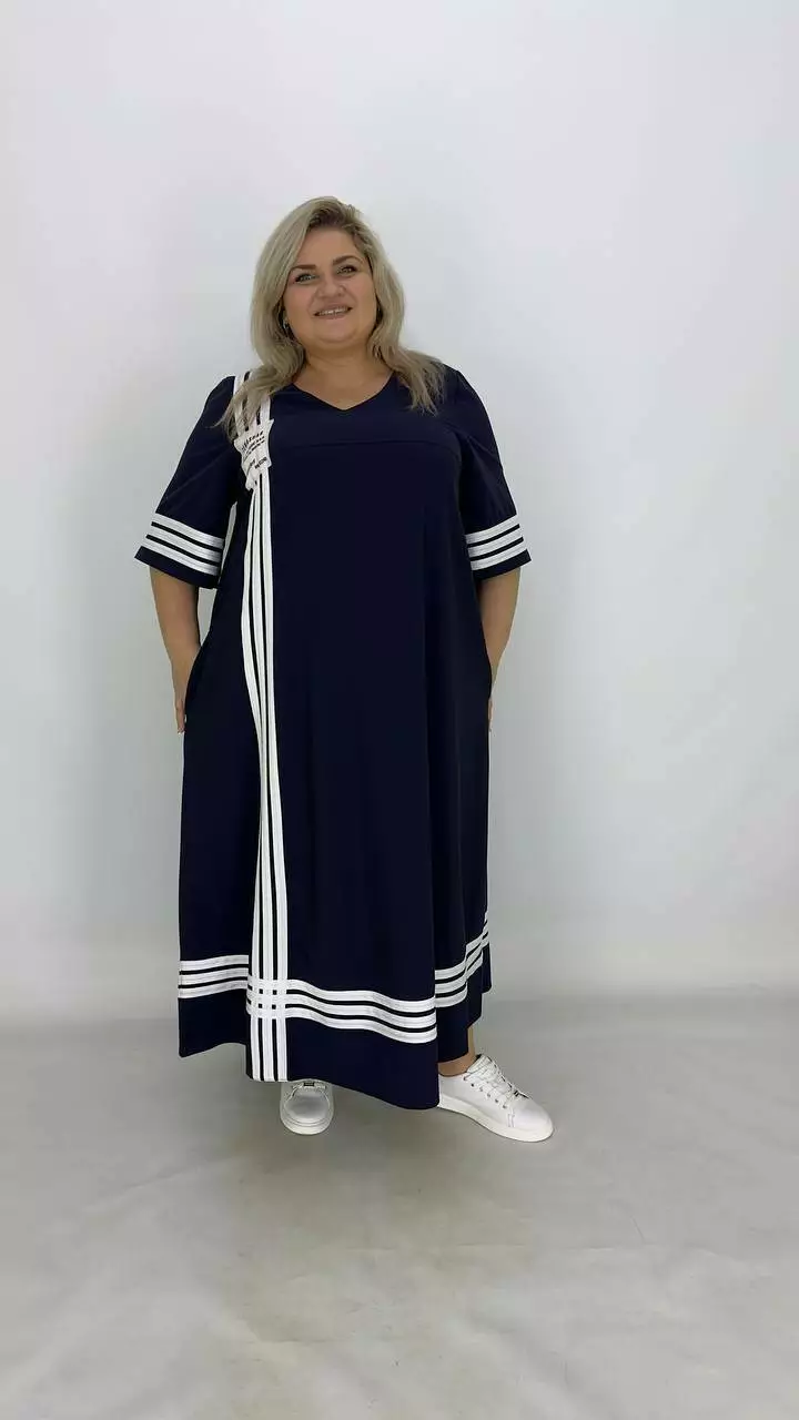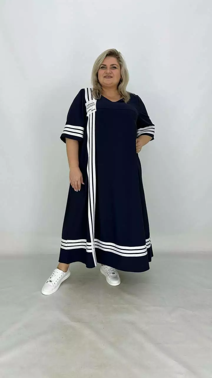 Силует трапеція, кишені в бічних швах, горловина мисик, рукави втачні, широкі. Сукня оздоблена пришивними лампасами. Рекомендоване прання 40 градусів.
