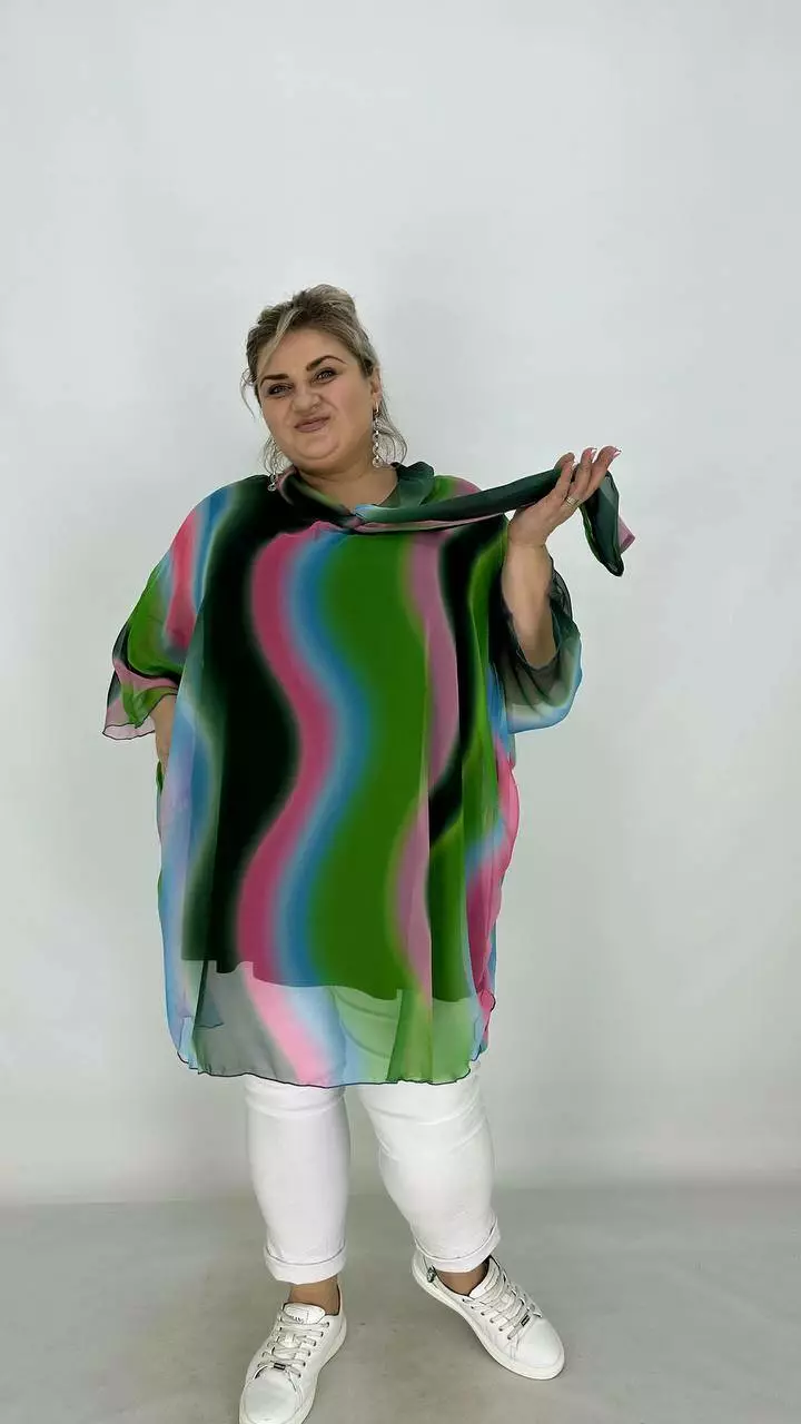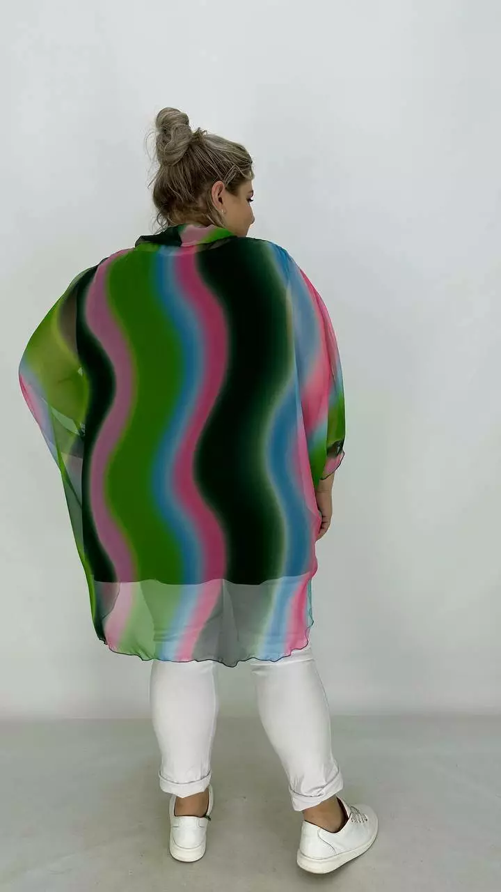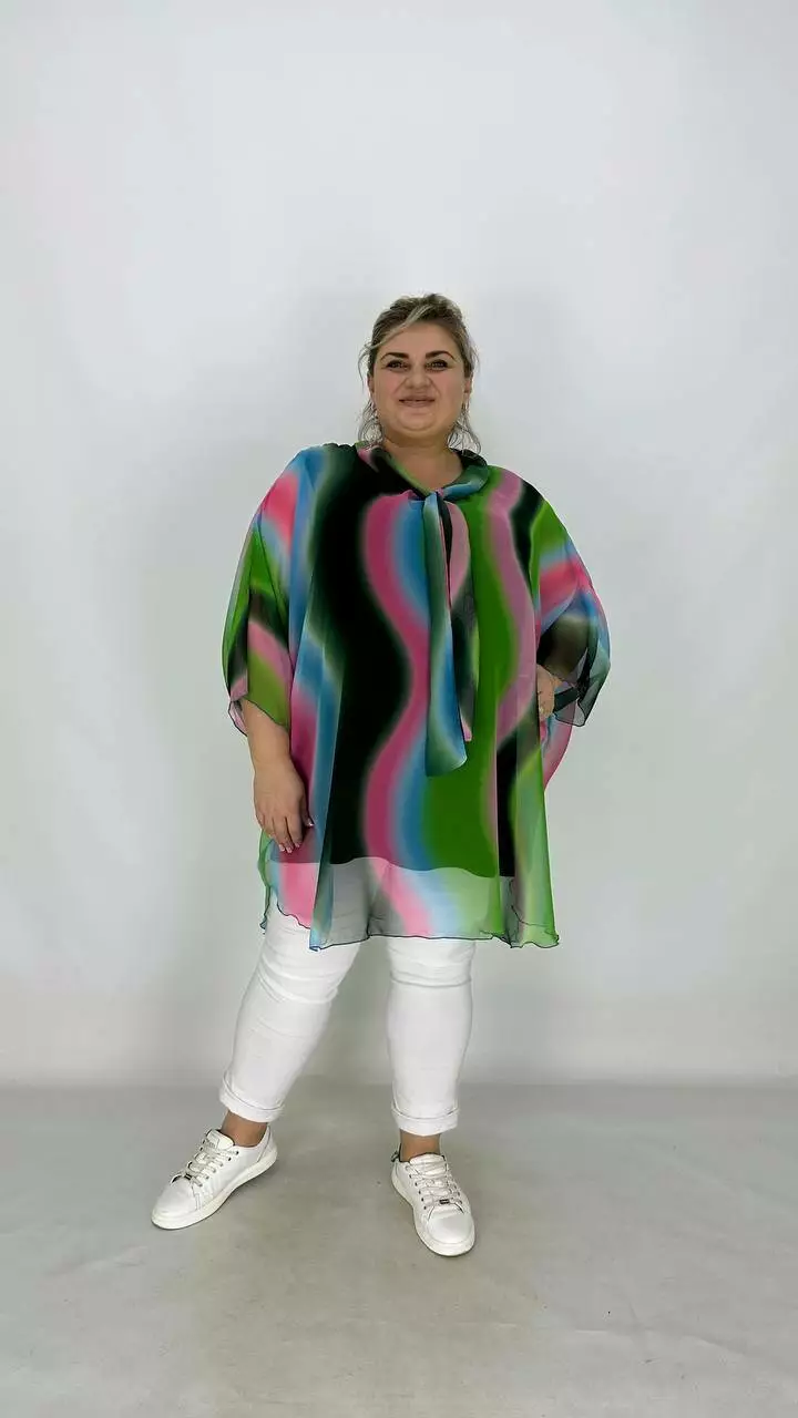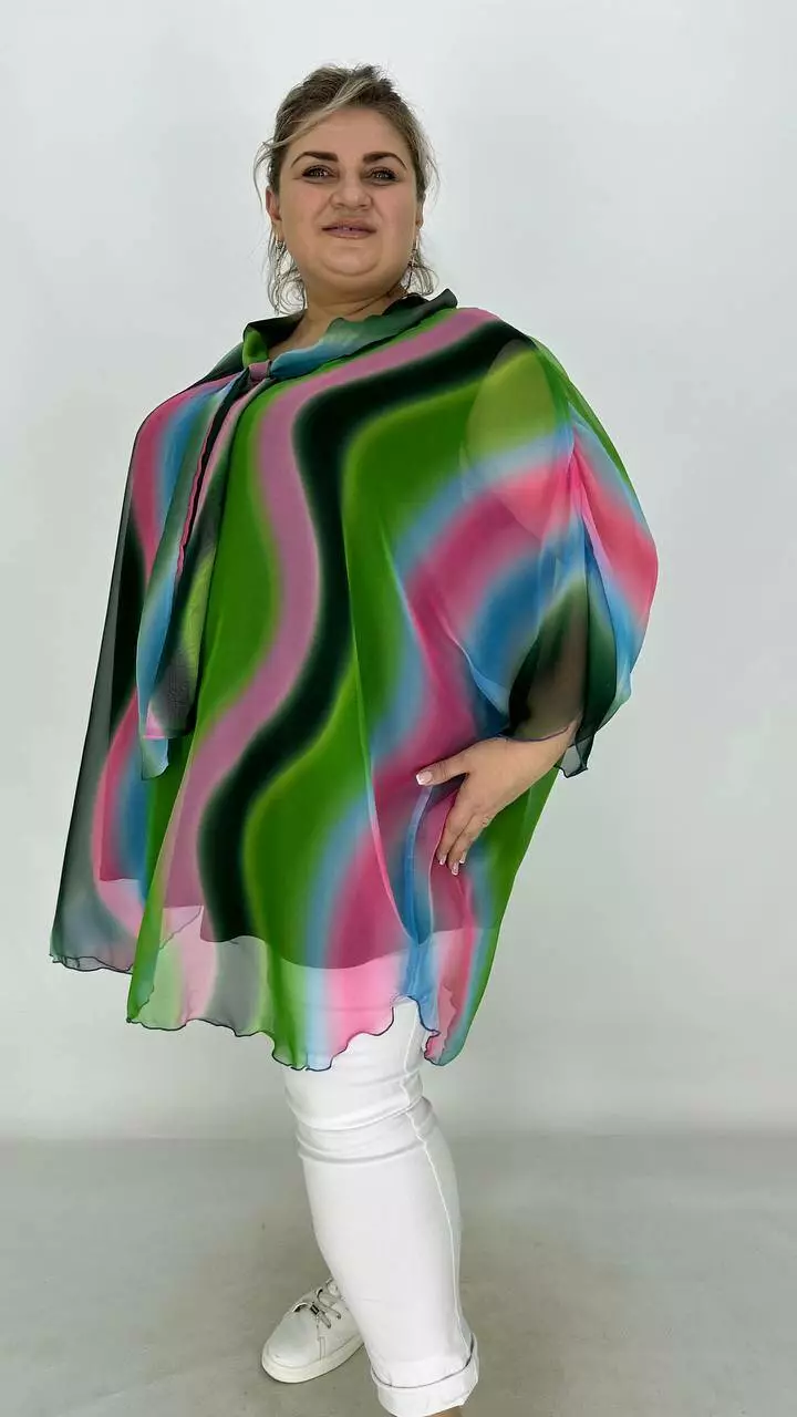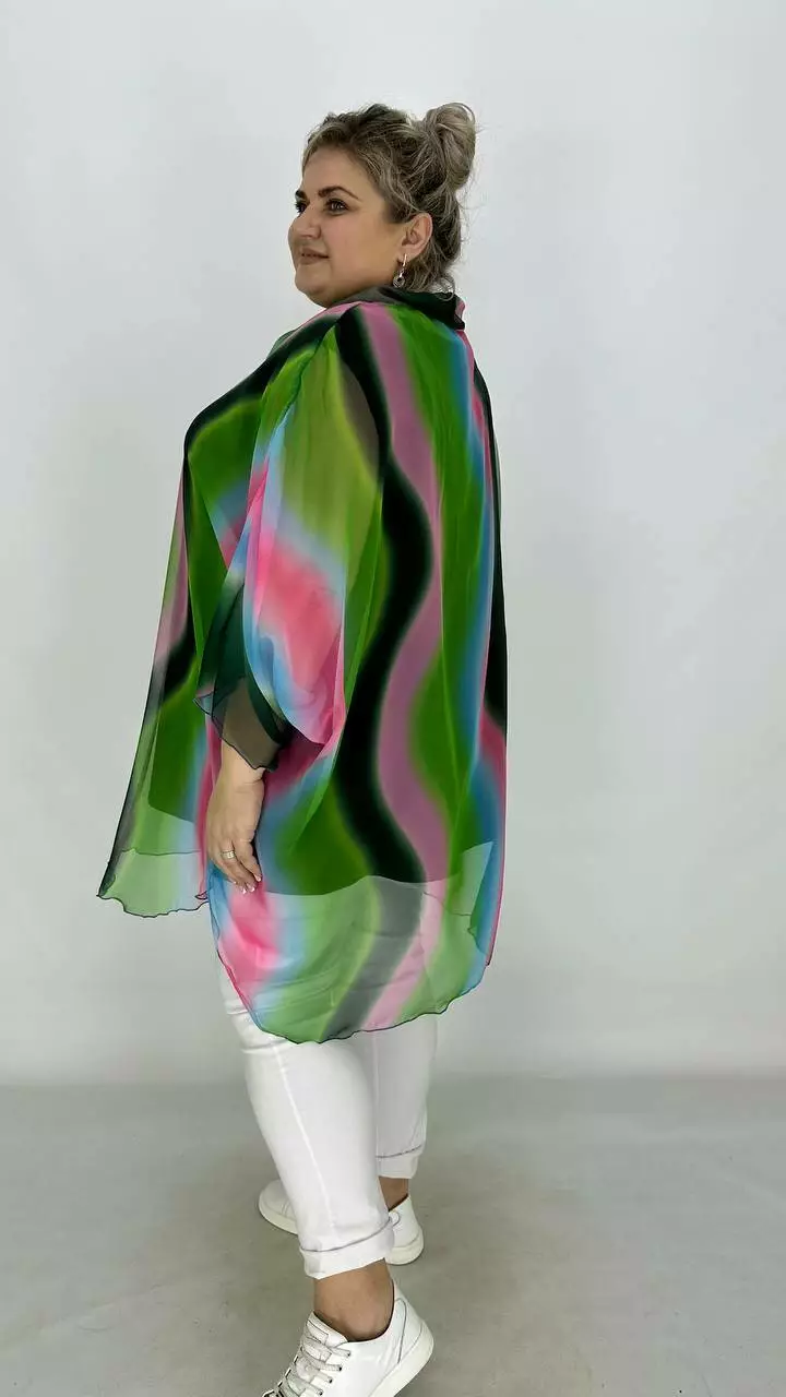 Накидка з найніжнішого шифону з цільнокроєним рукавом кажан, по горловині комір із зав'язками-бантом. Майка з віскози з дуже гарною розтяжністю.
