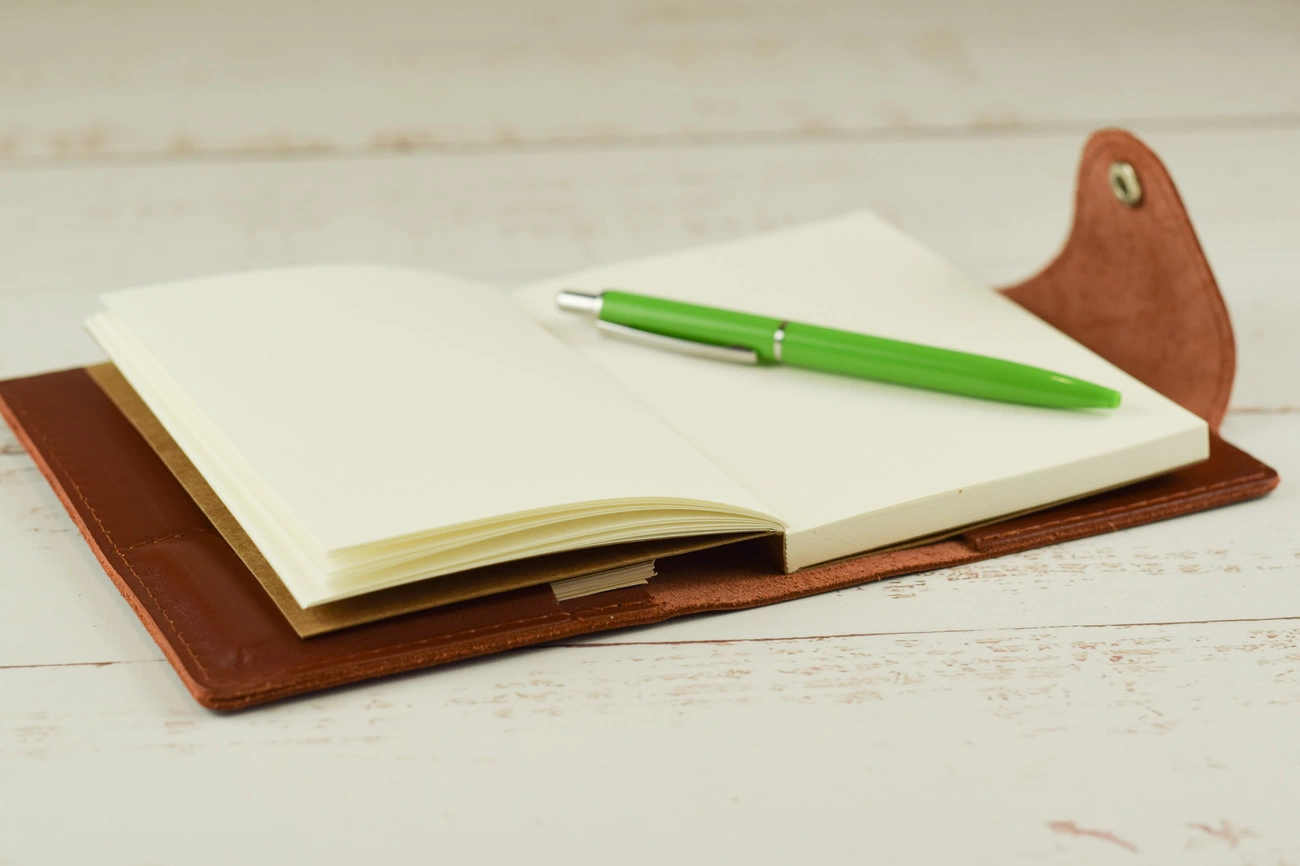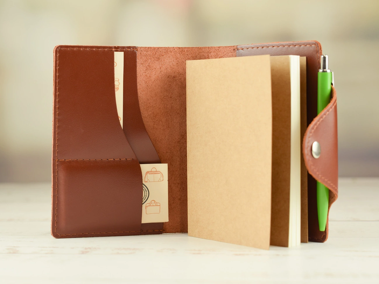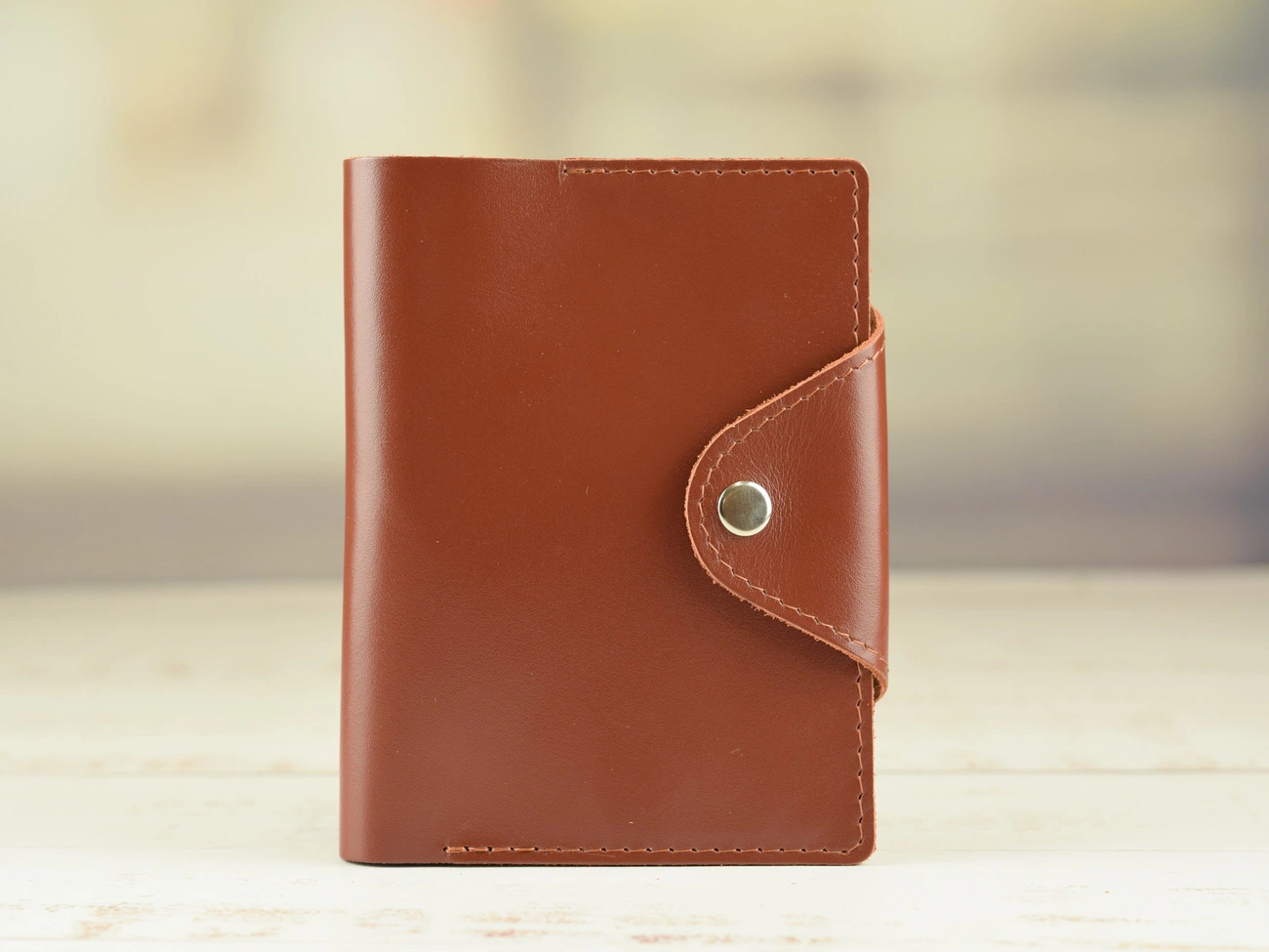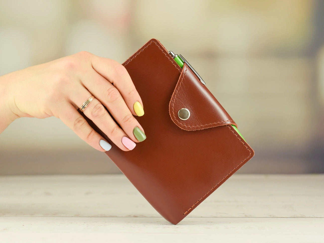 Блокнот у шкіряній обкладинці. Закривається на металеву кнопку. Всередині два відділення для карток та візиток.