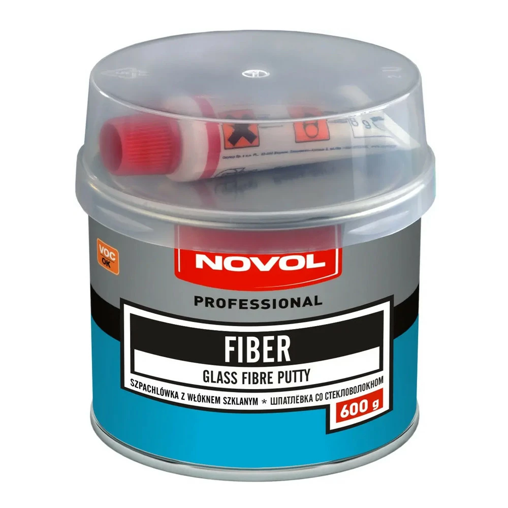 Шпаклевка с добавкой стеклянных волокон. Благодаря специальным добавкам обладает высокой механической прочностью и превосходной способностью к заполнению неровностей и отверстий. Шпаклевка со стекловолокном представляет собой двухкомпонентный продукт. Первый компонент – дисперсия стекловолокна и налитые в ненасыщенную полиэфирную смолу. Второй компонент – отвердитель – вызывает полимеризацию. Novol FIBER служит для покрытия тонких проржавевших мест и заполнения небольших дыр (пробоин) на поверхности кузова авто. Его также применяют в ремонте лодок, кемпинговых прицепов. Очень легко воспроизвести прочность, водонепроницаемость и высокую сцепку с металлом, бетоном и некоторыми пластмассами.