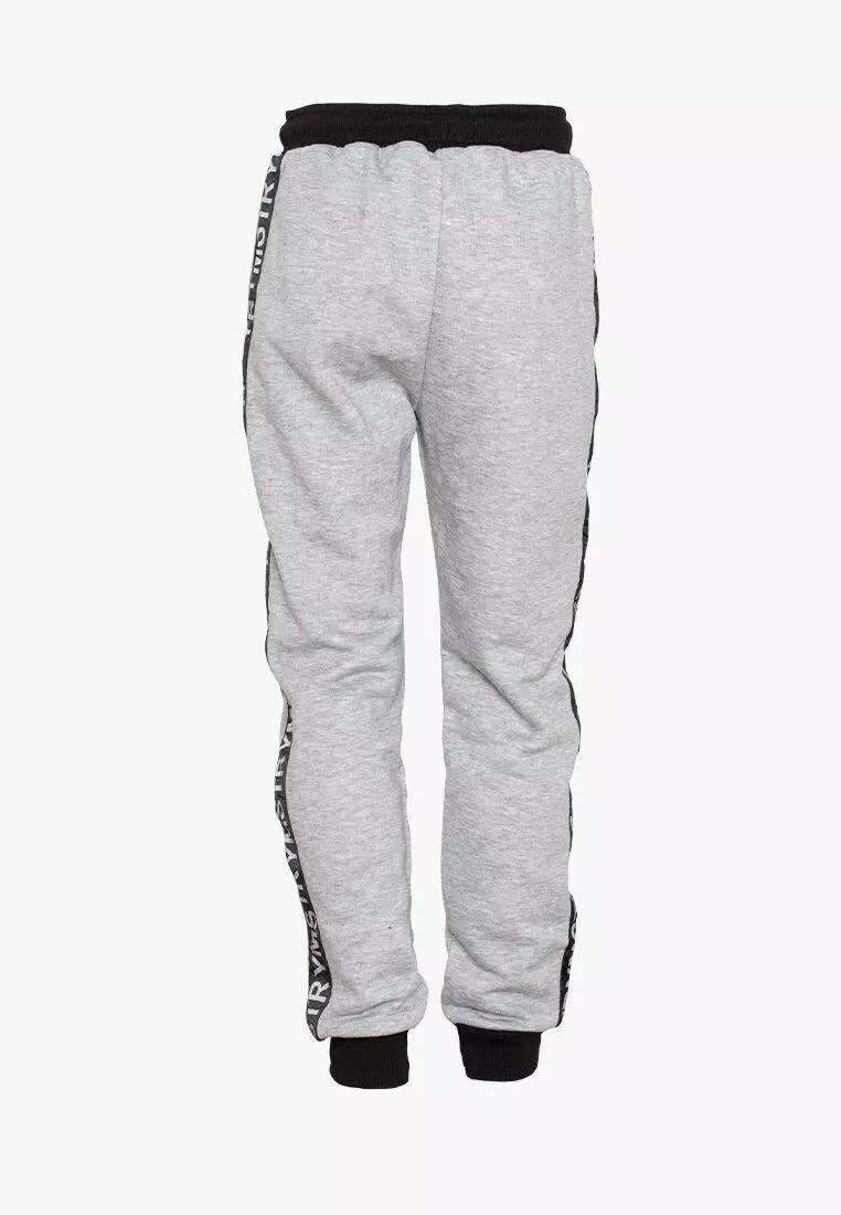 Круті сірі штани з резинкою внизу.