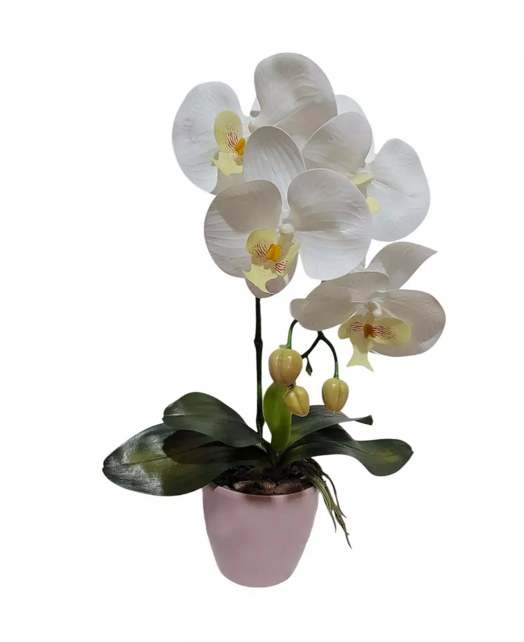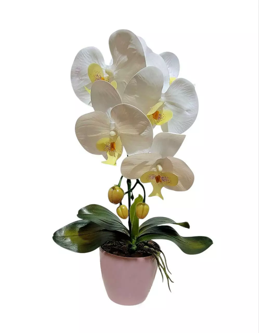 Штучна орхідея біла одинарна на 5 суцвіть з латексу у пластмасовому рожевому горщику, розмір 42*16см. Упакован у плівку.