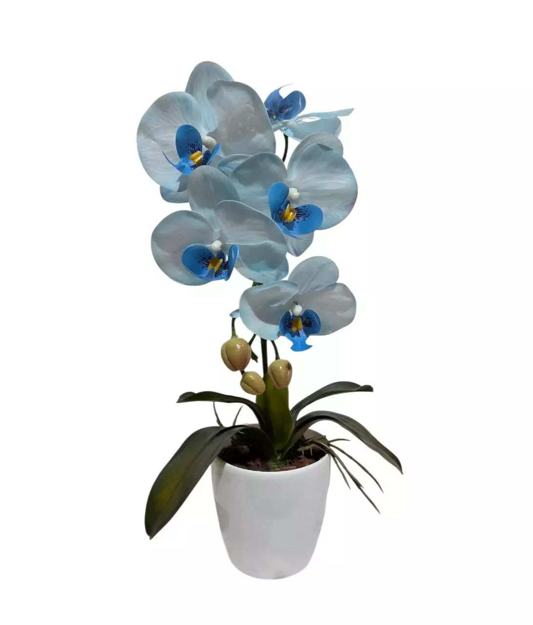 Штучна орхідея блакитна одинарна з латексу у пластмасовому білому горщику, розмір 42*16см. Упакован у плівку.