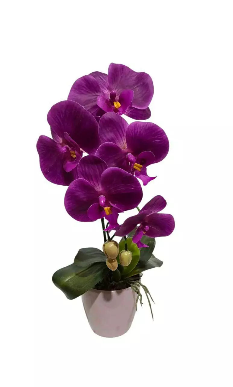 Штучна орхідея фіолетова одинарна з латексу у пластмасовому білому горщику, розмір 42*16см. Упакован у плівку.