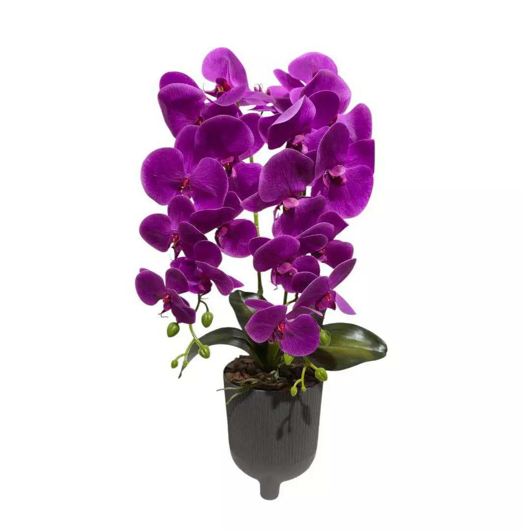 Штучна орхідея подвійна з латексу фіолетового кольору на 9 суцвіть 54*24см у пластмасовому сірому горщику. Упакована у плівку.