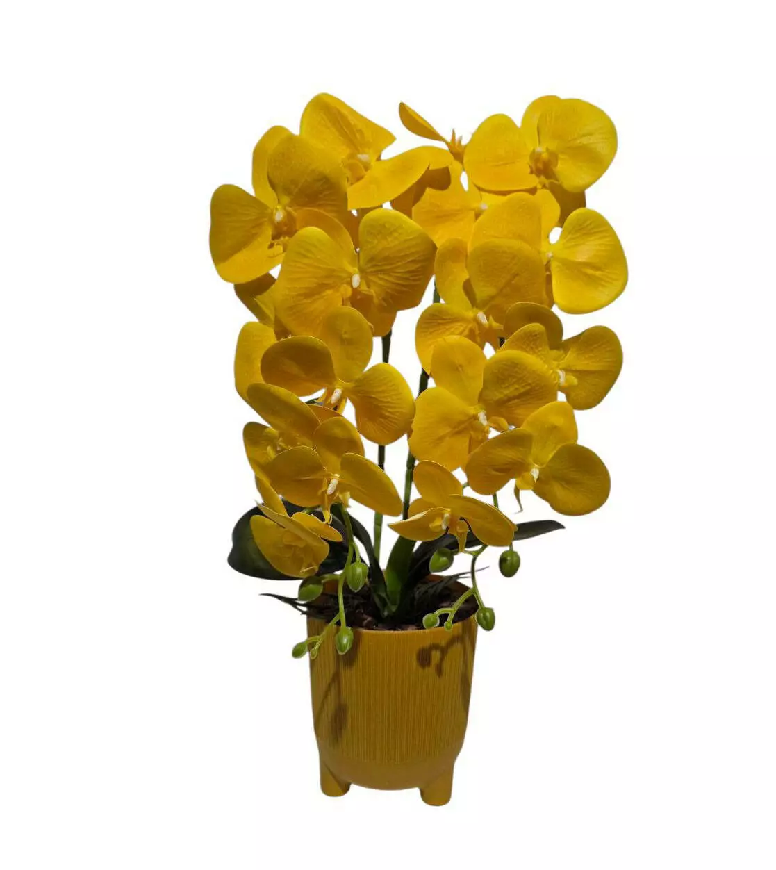 Штучна орхідея подвійна з латексу жовтого кольору на 9 суцвіть 54*24см у пластмасовому жовтому горщику. Упакована у плівку.