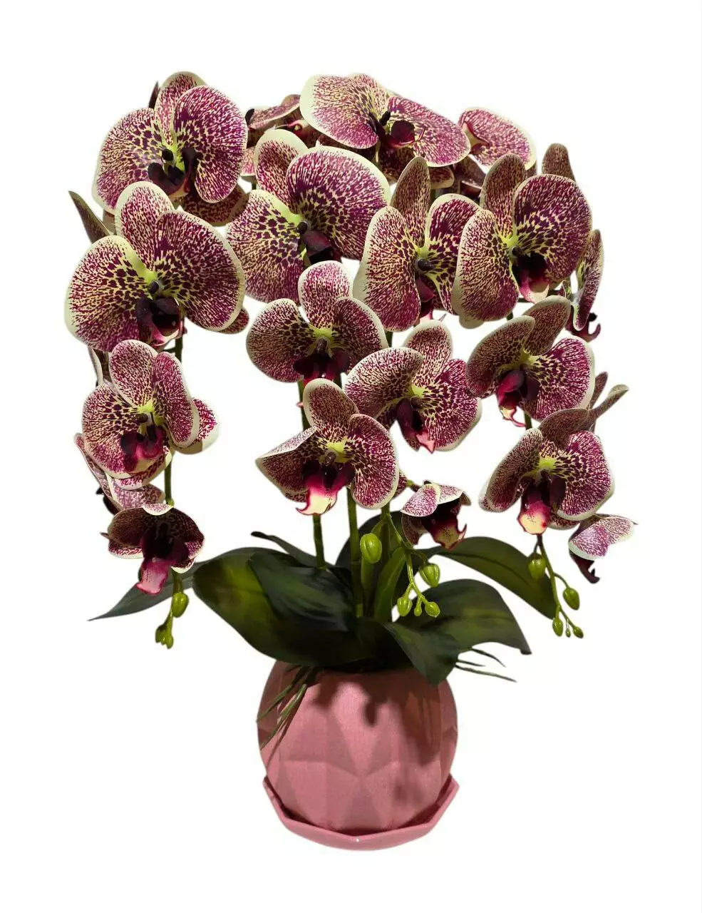 Штучна орхідея потрійна тигрово-бордова з латексу на 3 гілки у кераміческому рожевому горщику 52*32см. Упакована у плівку.