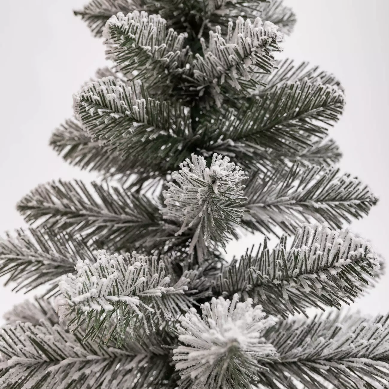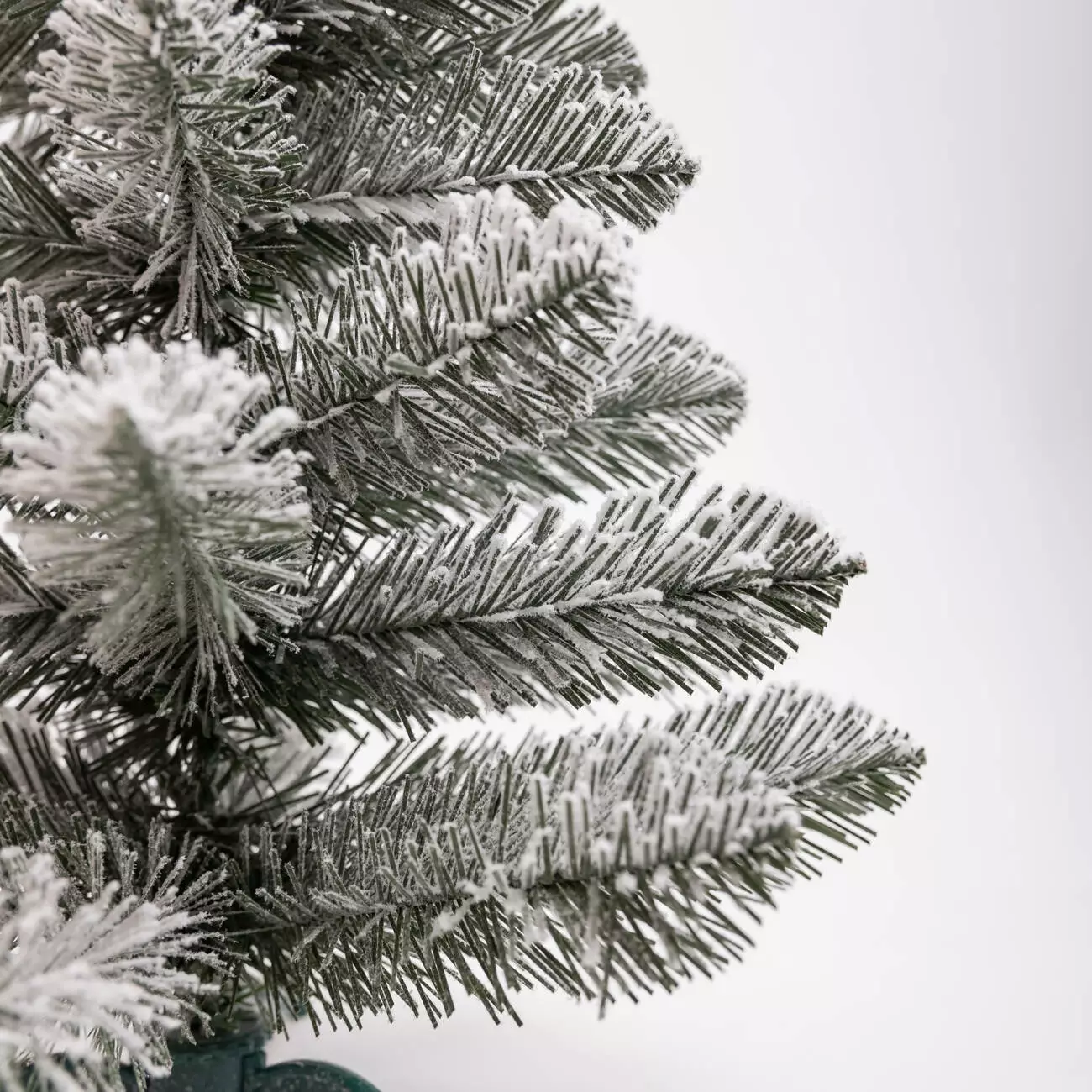 Гілки мають конічну форму, а зелені голочки довжиною до 2,5 см покриті м’яким штучним снігом, завдяки чому ялинка виглядає максимально природно, немов справжнє зимове деревце. Стовбур виготовлений із дроту, а пластикова опора додає стабільності та надійності конструкції.