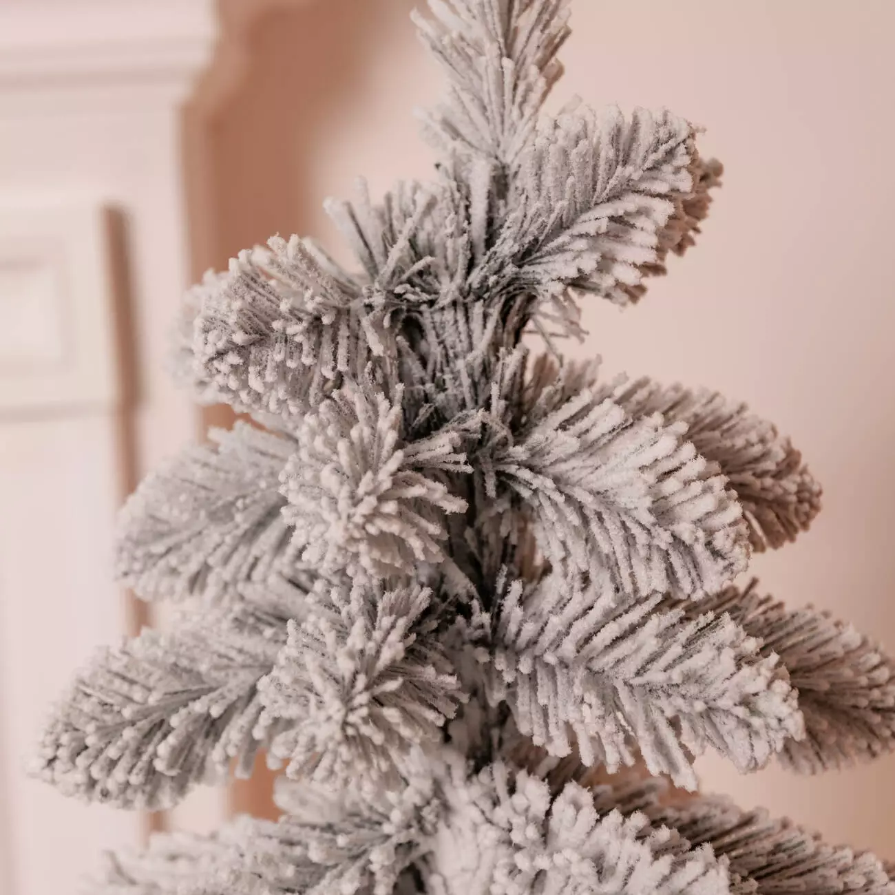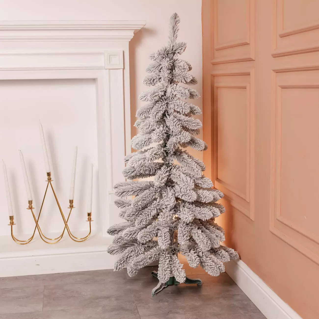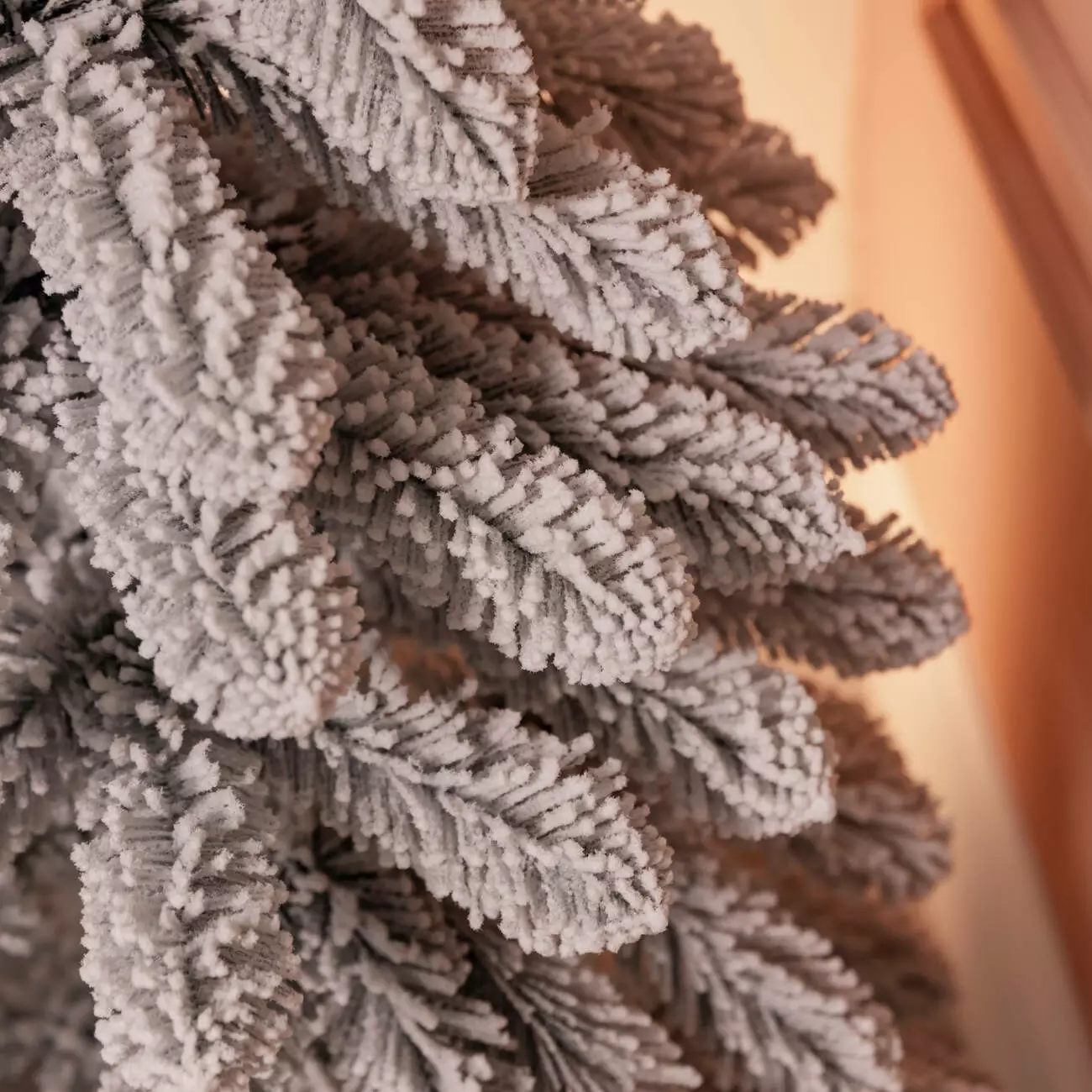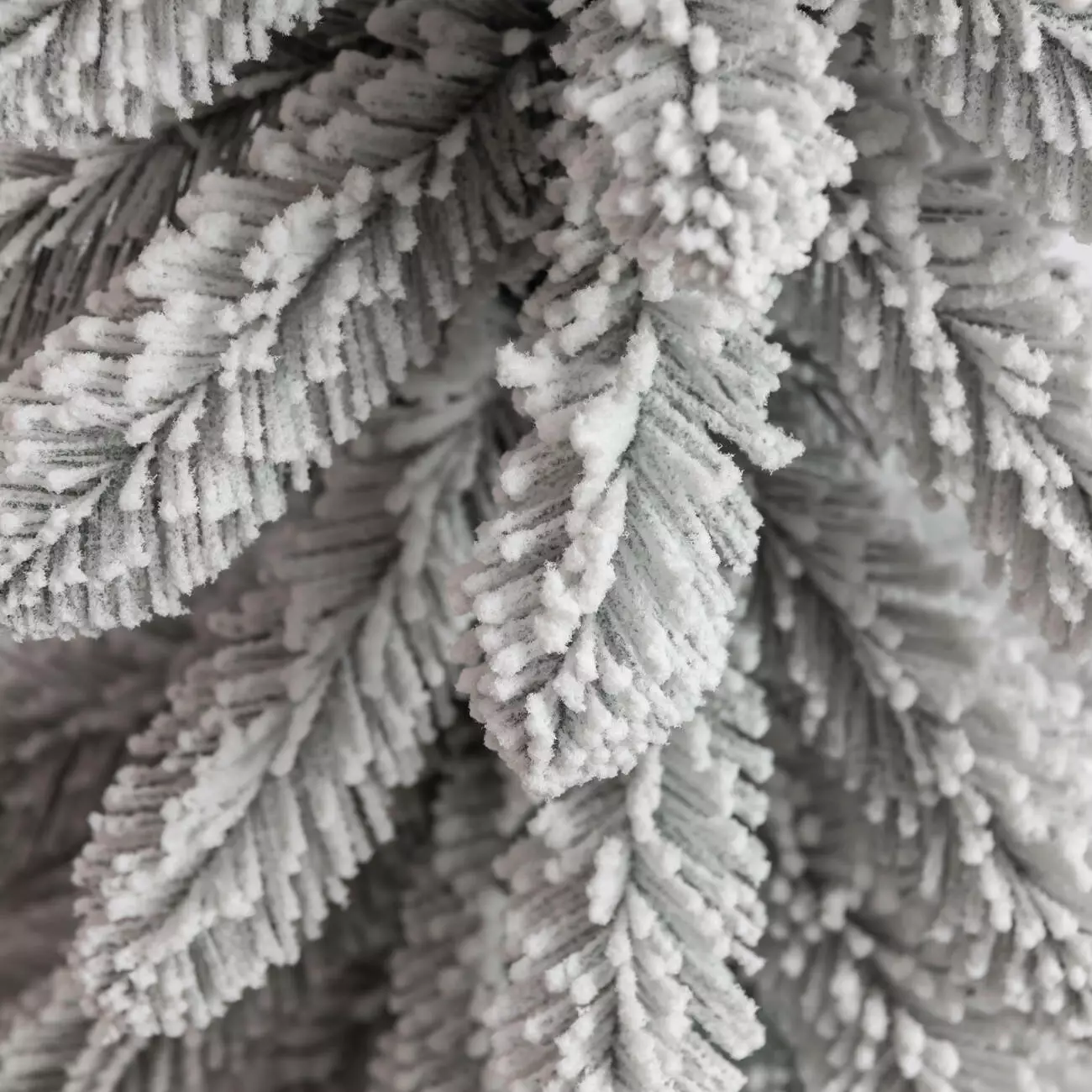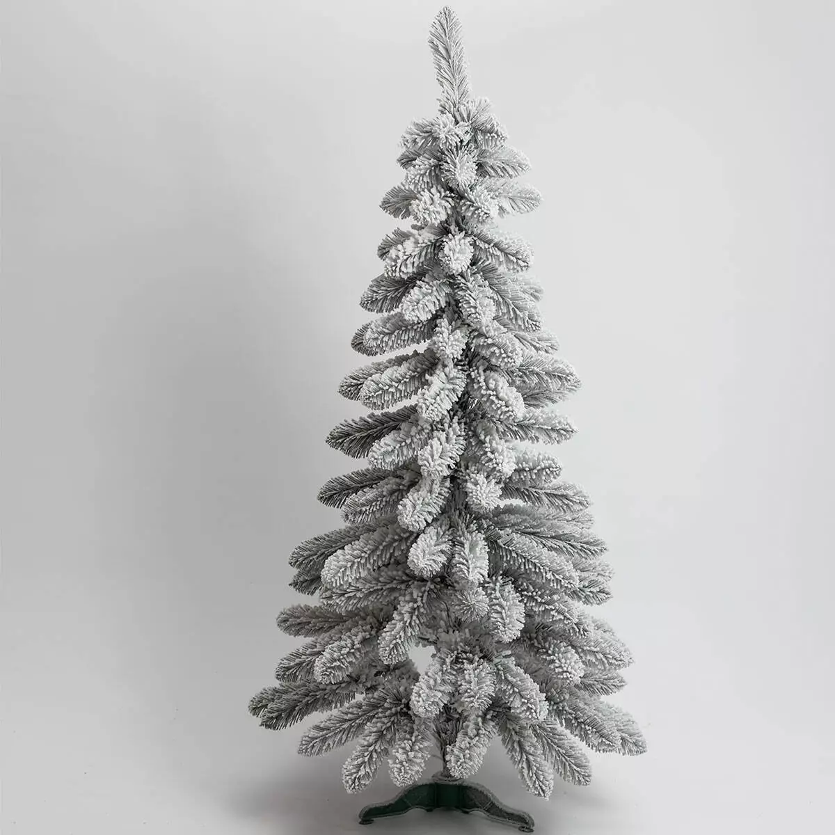 Гілки мають конічну форму, а зелені голочки довжиною до 3,5 см покриті м’яким штучним снігом і опущені вниз, завдяки чому ялинка виглядає максимально природно, немов молода смерека, вкрита свіжим снігом. Стовбур виготовлений із дроту, а пластикова опора забезпечує стабільність конструкції навіть при висоті понад метр.
