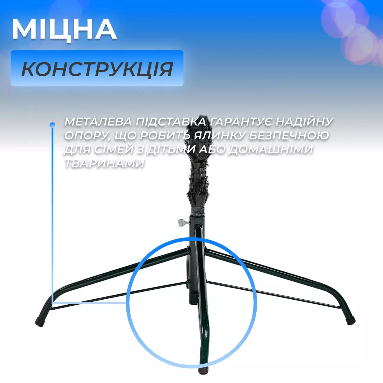 Ялинка складається з 11 ярусів із 117 пишними гілочками, що створюють об’єм і виглядають естетично навіть без додаткових прикрас. Металева підставка гарантує стійкість і надійність конструкції, що дозволяє розмістити її в будь-якому куточку дому. Виготовлена з якісного поліетилену (ПЕ), ялинка зберігає форму й колір протягом багатьох років, додаючи вашому святу затишку та елегантності.