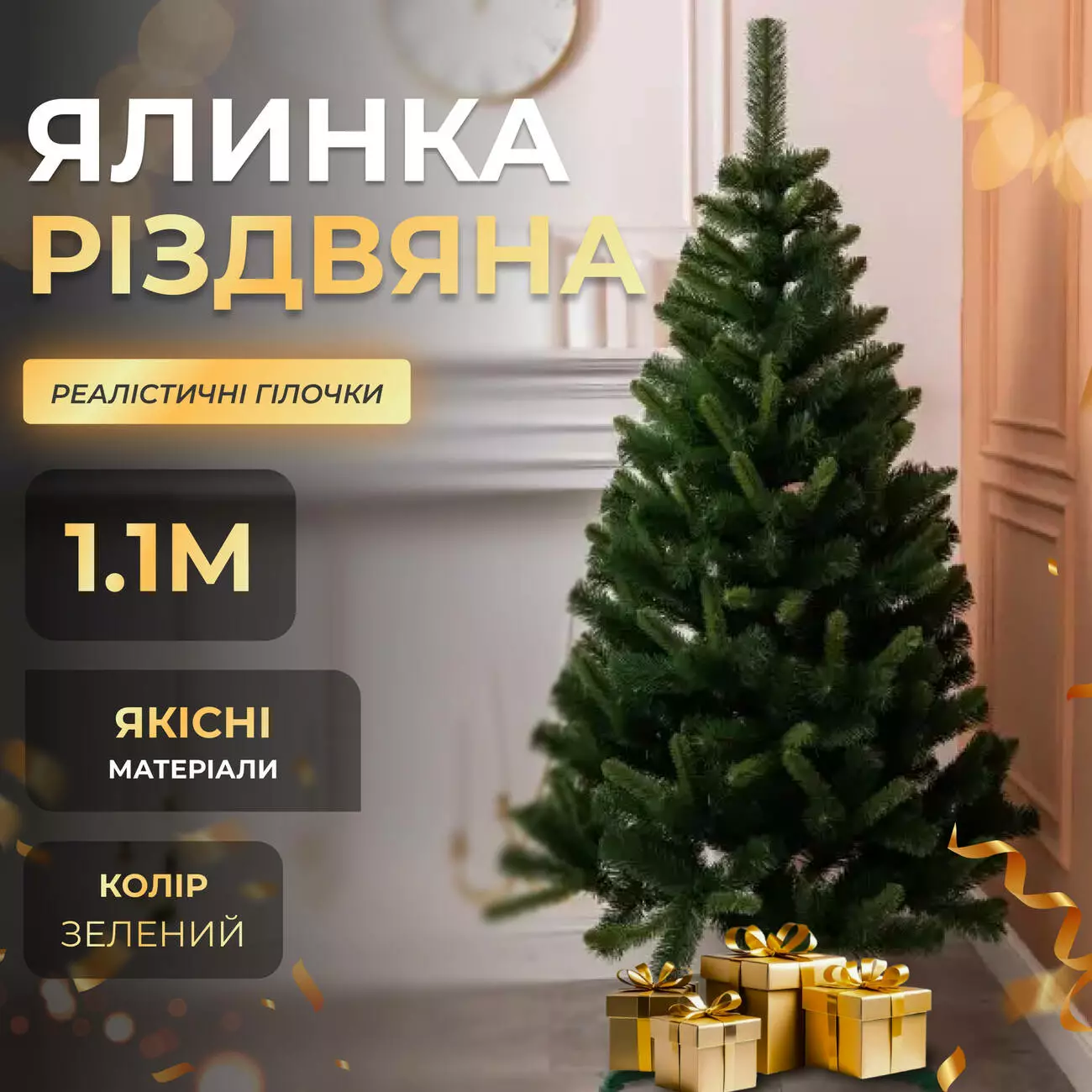 Штучна ялинка Різдвяна 1.1 м зелена — чудовий варіант для створення затишної святкової атмосфери вдома чи в офісі. Завдяки натуральному поєднанню зелених відтінків і реалістичній структурі голочок вона виглядає як справжня. М’яка хвоя з ПВХ (товщина 10 мкр.) приємна на дотик, не осипається і зберігає форму протягом багатьох сезонів.
