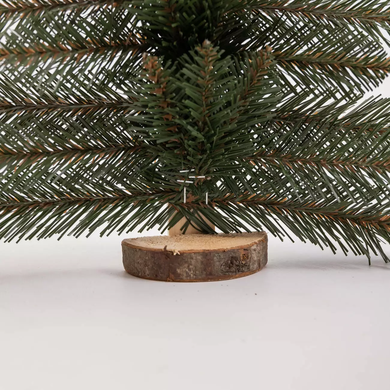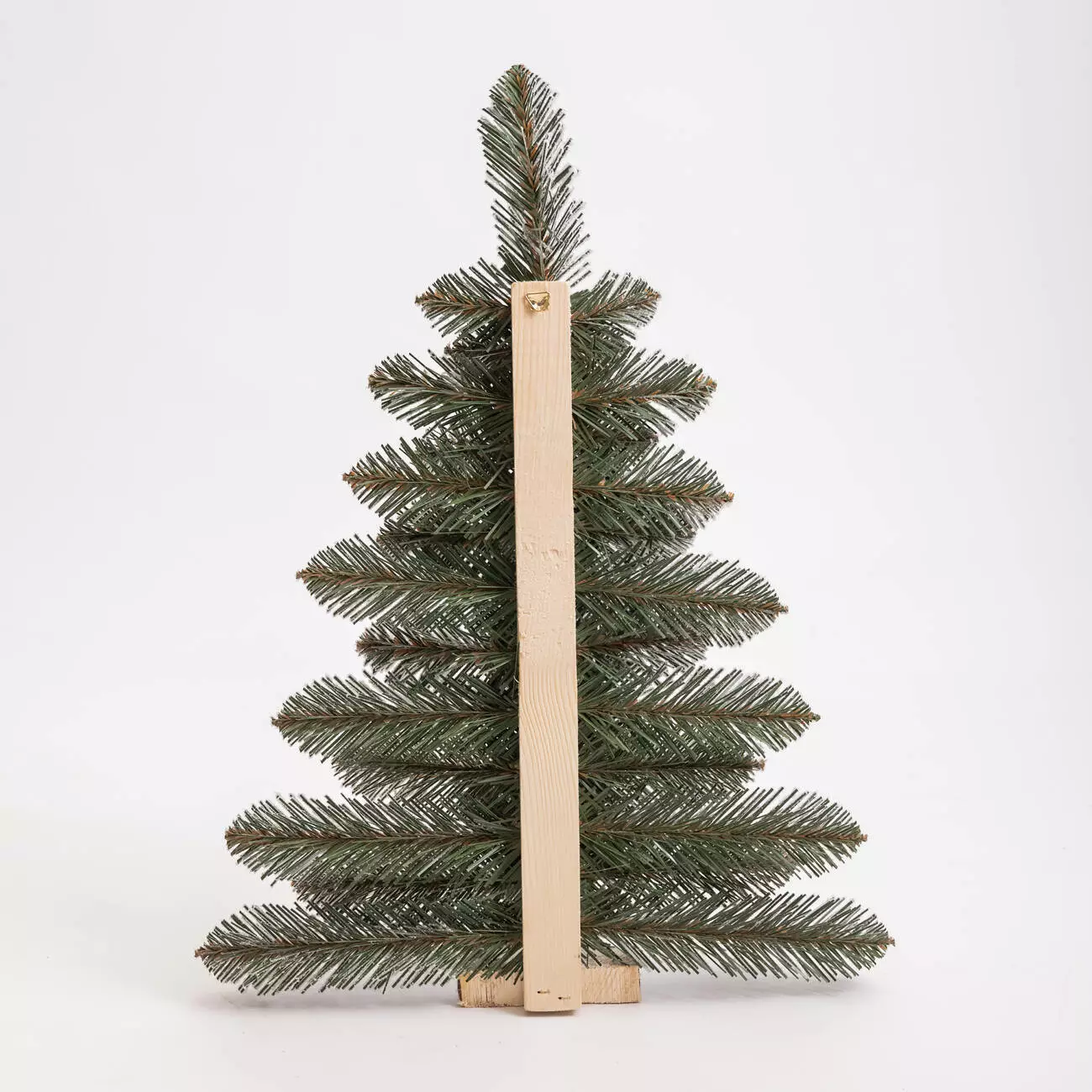 Основа ялинки виготовлена з натурального дерева, що забезпечує надійну фіксацію та стабільність конструкції. Гілки рівномірно розташовані по висоті, формуючи класичний трикутний силует. Голки зроблені з якісного ПВХ, який добре тримає форму, не осипається та має природний зелений відтінок, наближений до натуральної хвої.